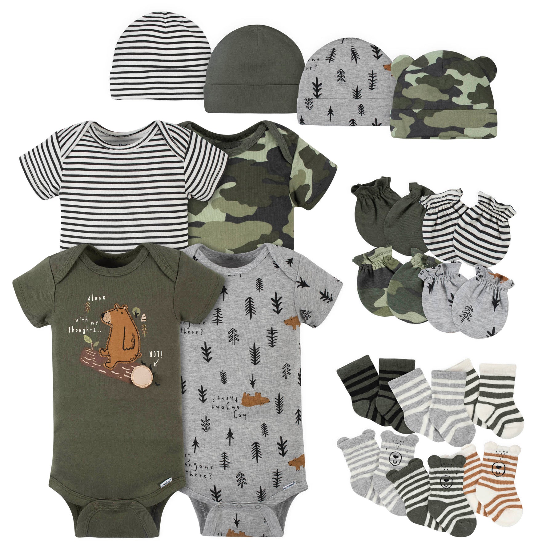 • Includes four short-sleeve Onesies® brand bodysuits, four pairs of no scratch mittens, four baby caps, six pairs of Wiggle-Proof™ socks