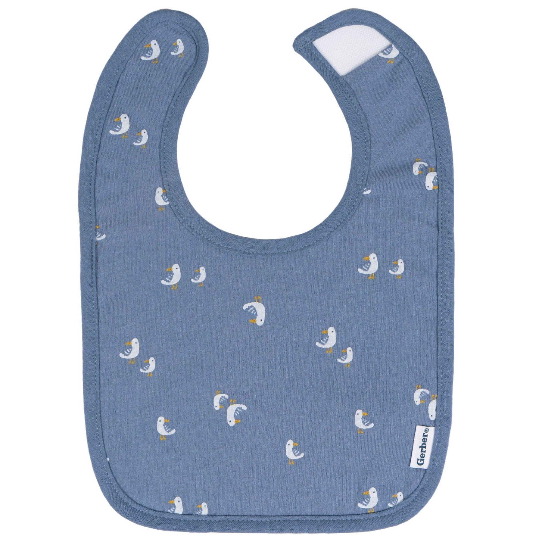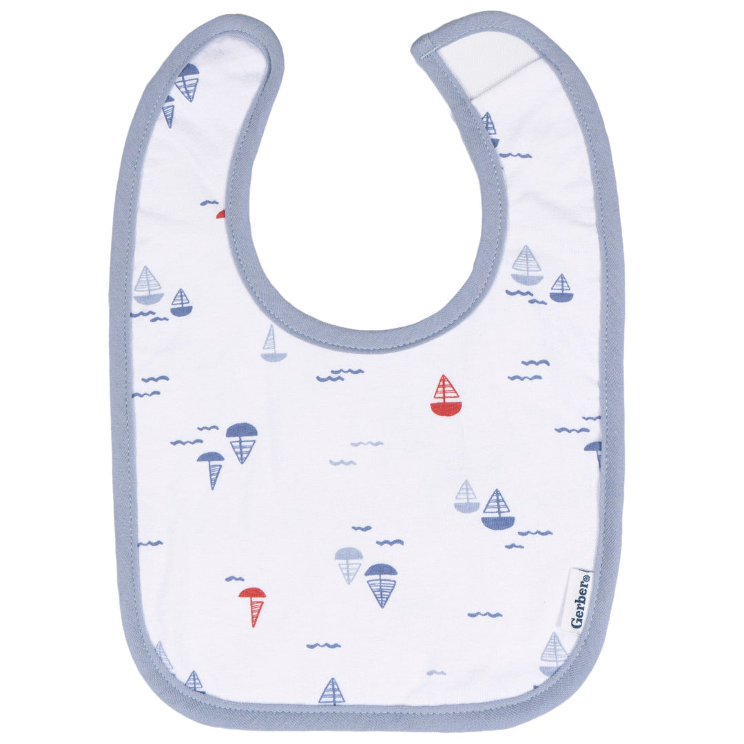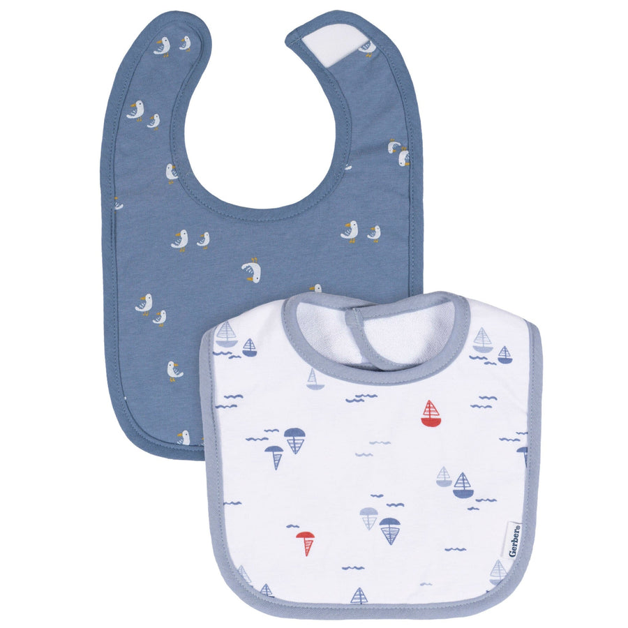 - One dark blue bib with seagull print, one white bib with sailboat print