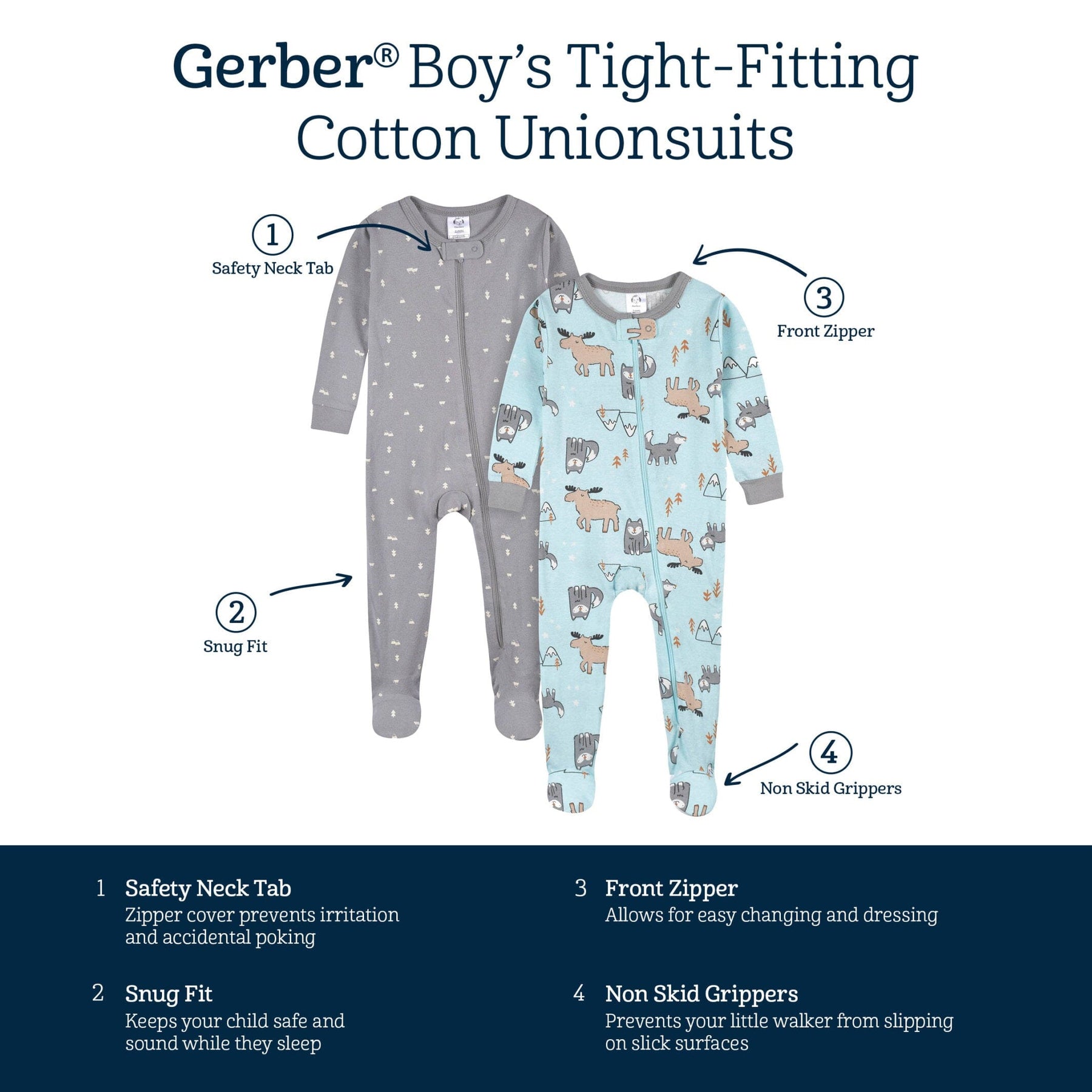 Our snug fit footed pajamas are designed for safe, comfortable sleeping. Each pair features an easy on and off design which is perfect for both babies and toddlers alike. We had our essentials independently certified with STANDARD 100 by OEKO-TEX® so that you don’t have to worry about harmful substances in your baby’s wardrobe. This pack includes two footed boys’ pajamas with blue and gray arctic animal theme.
