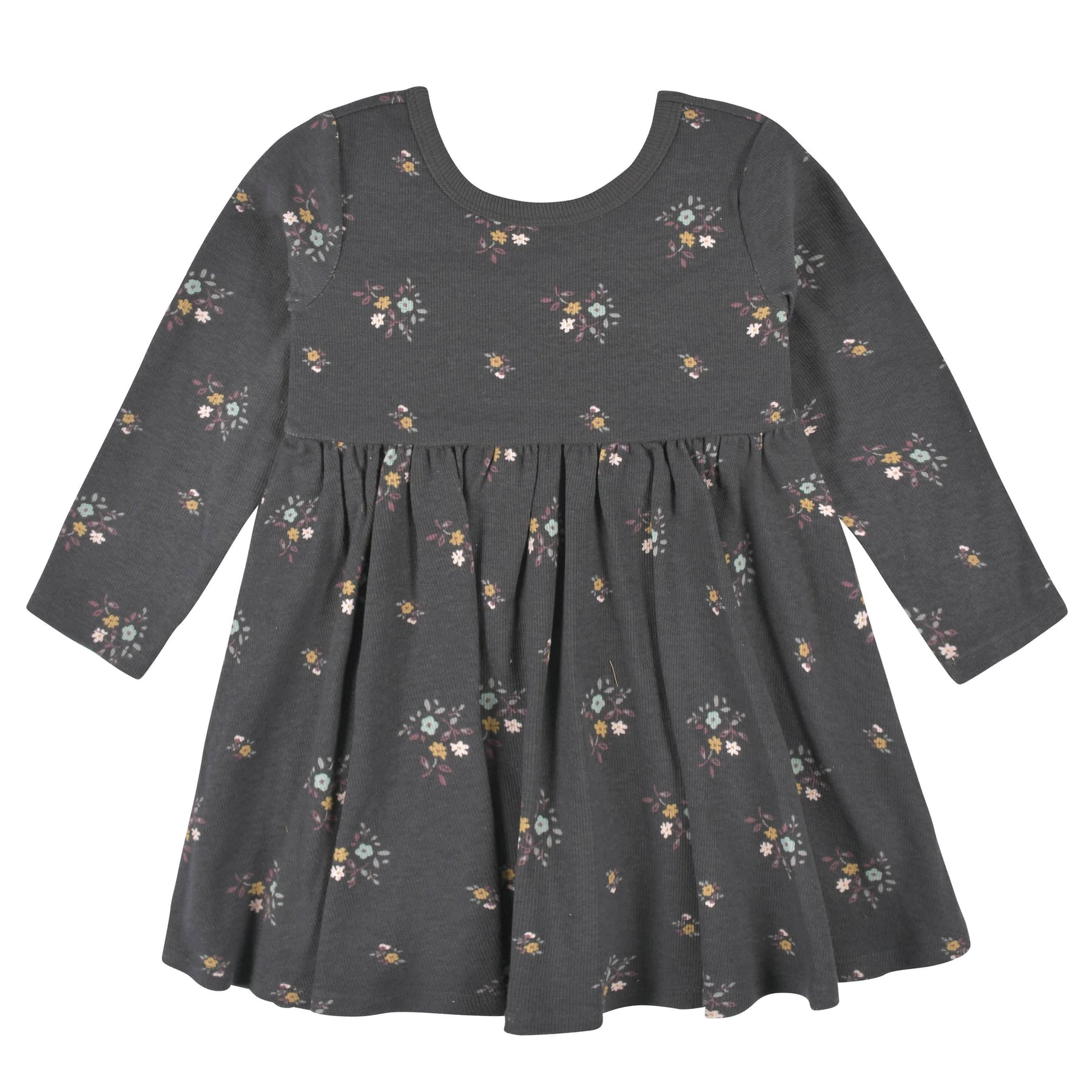• Made with soft, flat back rib cotton fabric to keep your child comfortable all day long. Fit and Flare dress that features long sleeves, empire waist and finished hemline. Pair with solid leggings or bike shorts for that extra coverage when playing and jumping around. Layer overtop with our jackets or sweaters for extra warmth! Perfect for those picture perfect moments or play dates.