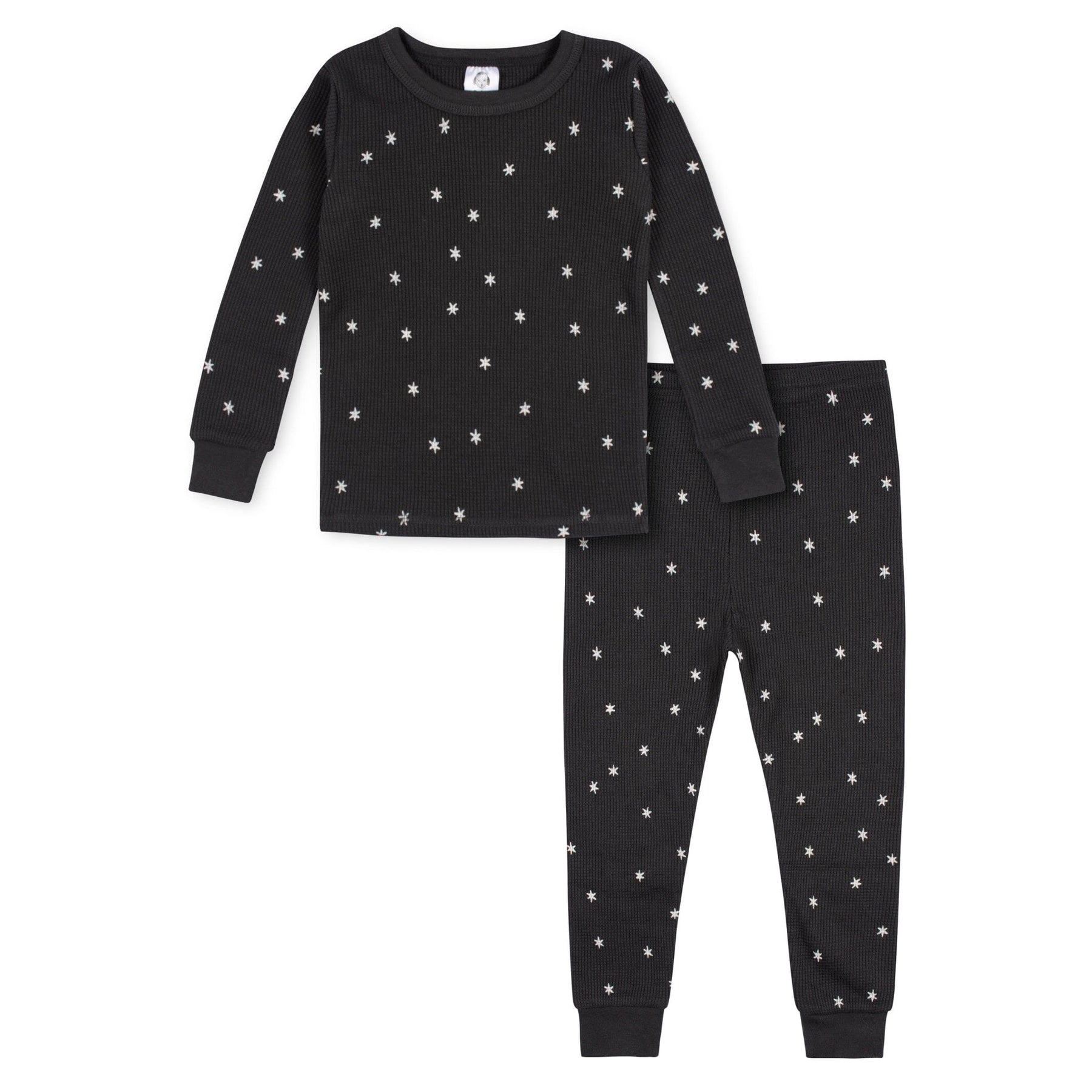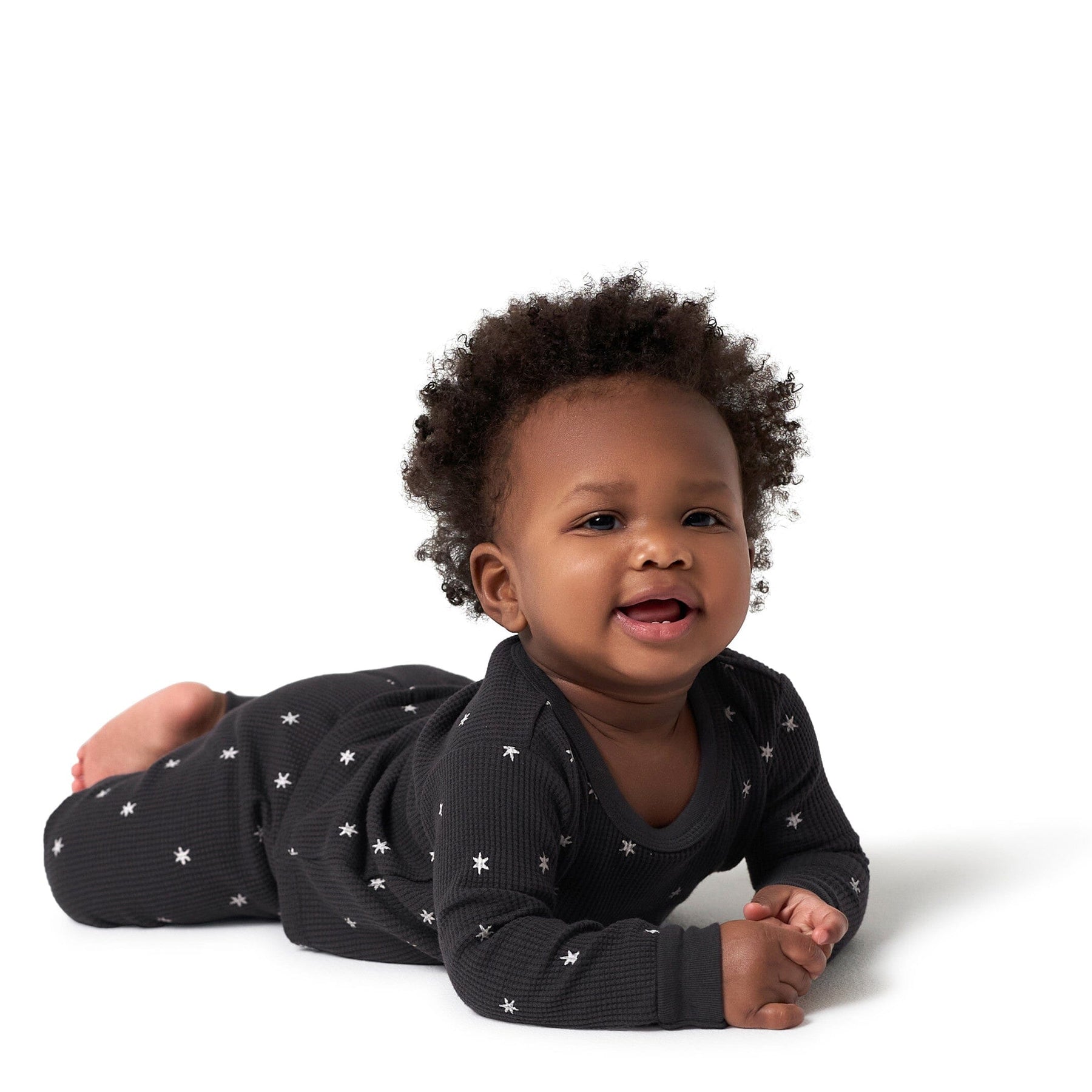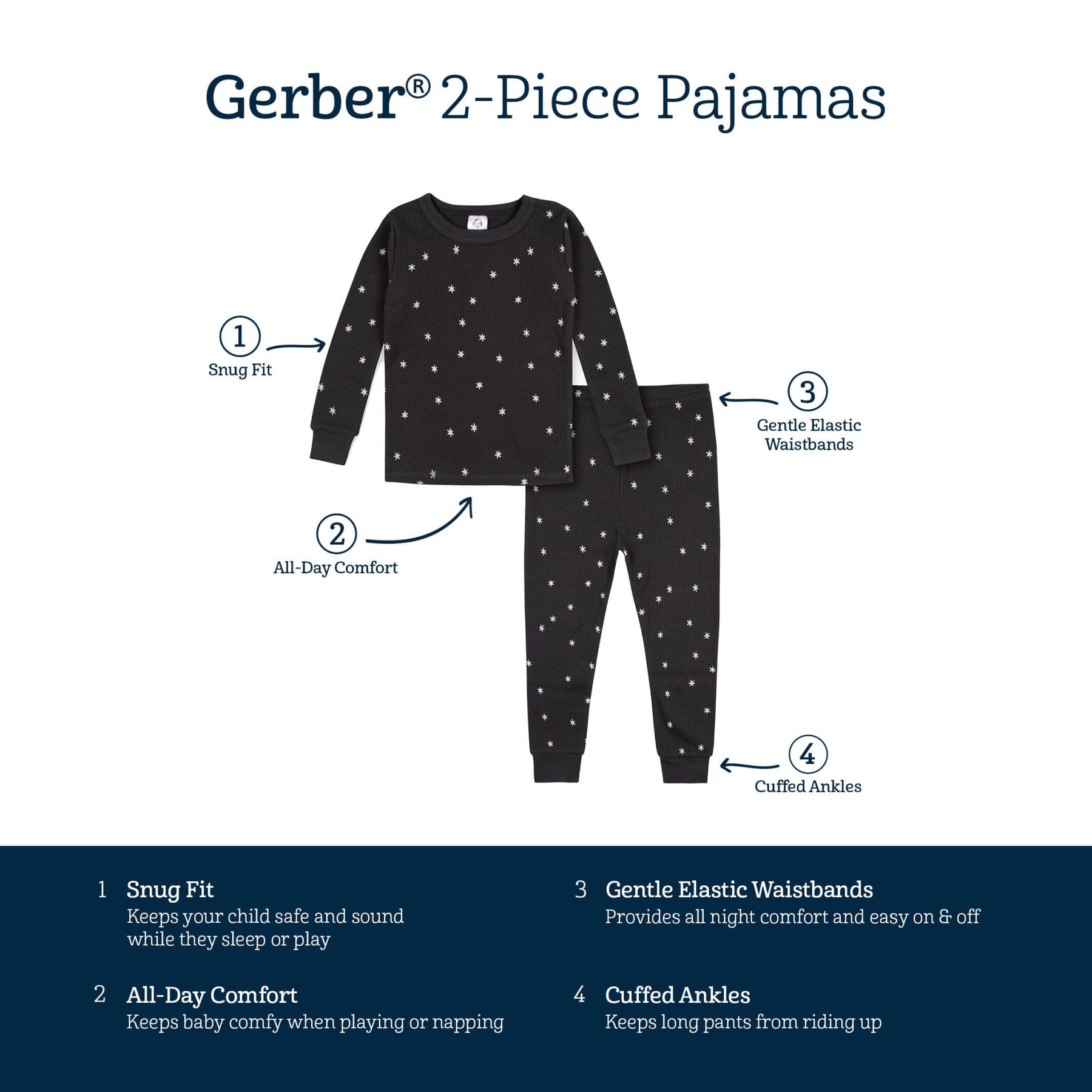 Gerber® extremely soft mini waffle cotton/poly blend 2-piece pajama sets are perfect for 'round the clock wear. Designed for safety, our baby and toddler PJ’s feature a snug fit. High-quality, lightweight, breathable, durable fabric with the perfect amount of stretch for active babies and toddlers. We had our essentials independently certified with STANDARD 100 by OEKO-TEX® so that you don’t have to worry about harmful substances in your little one’s wardrobe. Includes one gray allover star print long sleeve top and bottom set.