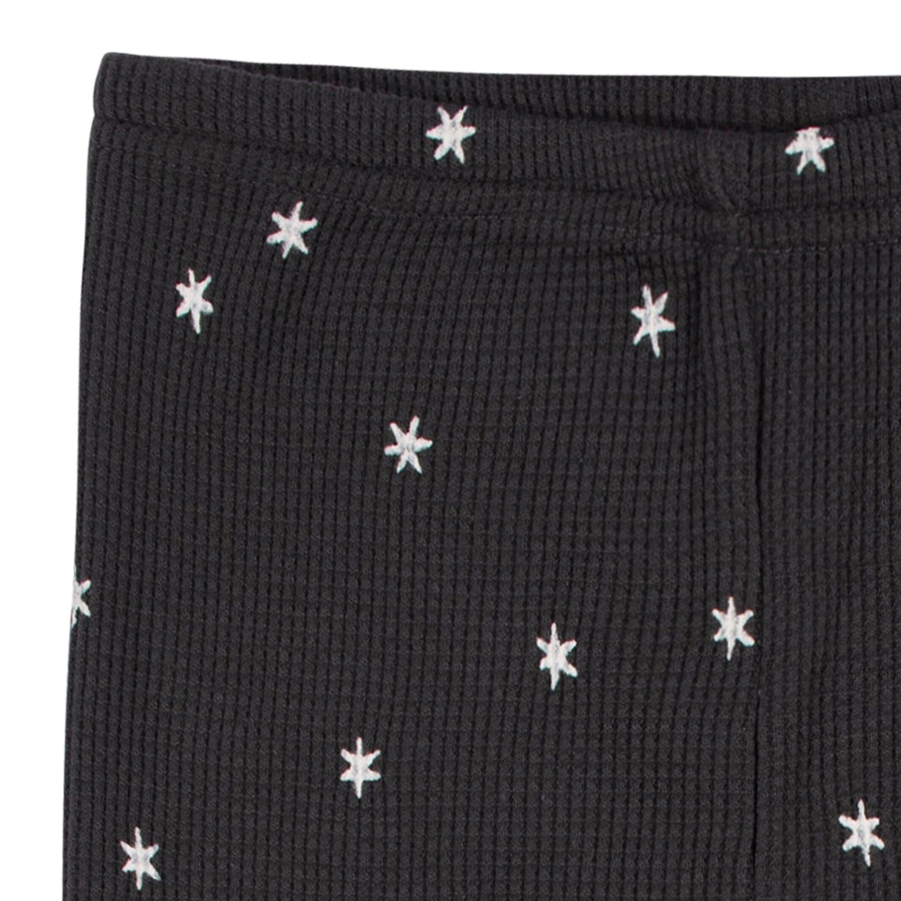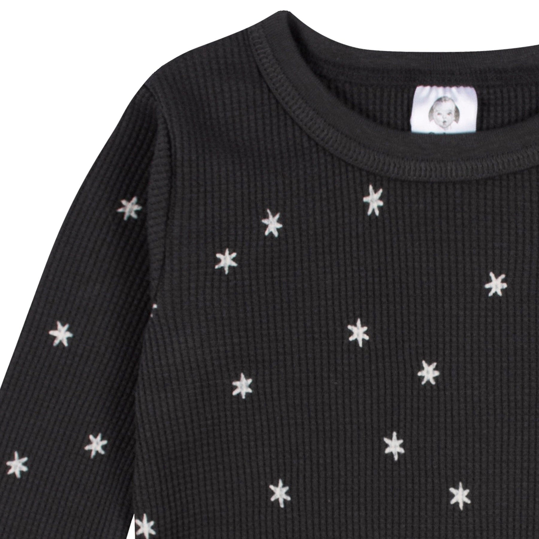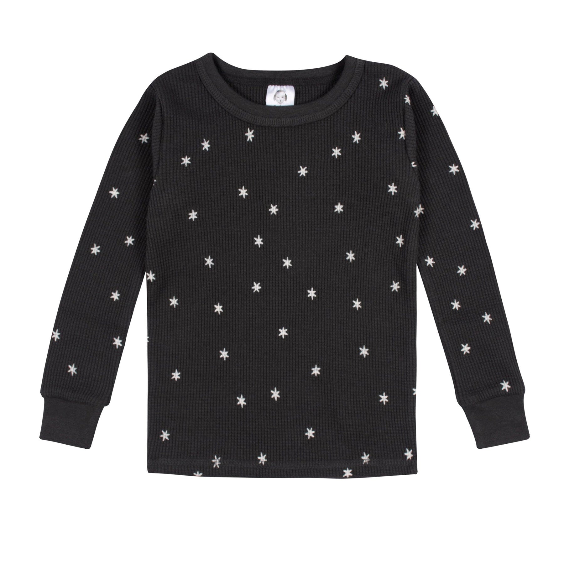 Gerber® extremely soft mini waffle cotton/poly blend 2-piece pajama sets are perfect for 'round the clock wear. Designed for safety, our baby and toddler PJ’s feature a snug fit. High-quality, lightweight, breathable, durable fabric with the perfect amount of stretch for active babies and toddlers. We had our essentials independently certified with STANDARD 100 by OEKO-TEX® so that you don’t have to worry about harmful substances in your little one’s wardrobe. Includes one gray allover star print long sleeve top and bottom set.