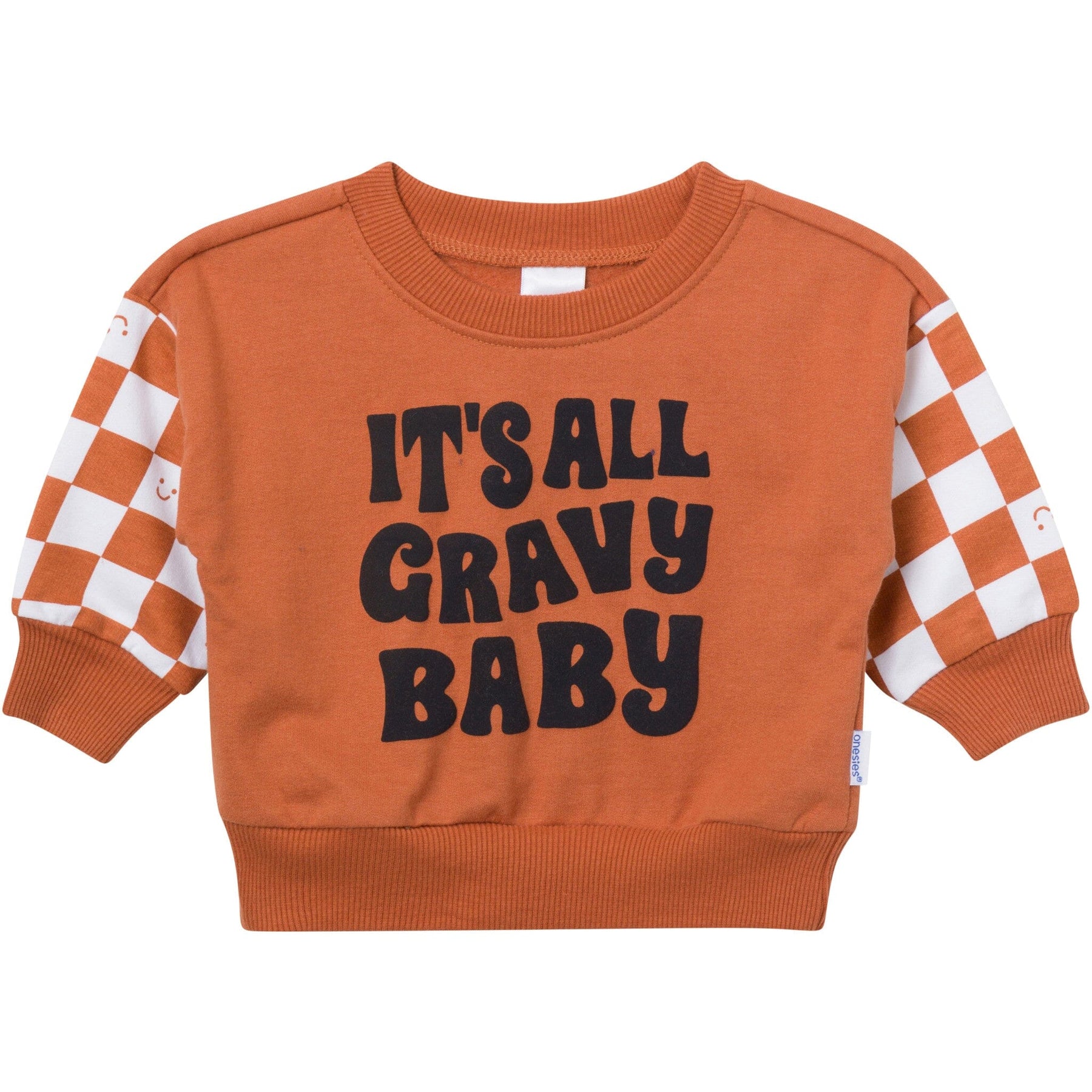 Spice up his style with the “It’s All Gravy Baby” set! This rust-toned outfit features soft, cozy fabric, a drop-shoulder sweatshirt with puff-print lettering, and fun checkerboard sleeves. Ribbed edges and a relaxed fit make it ideal for layering and keeping warm on cool days—comfort that’s served up with style. Our essentials have been independently certified with STANDARD 100 by OEKO-TEX® so that you don’t have to worry about harmful substances in your baby’s wardrobe. Includes baby boy sweatshirt and pants set.