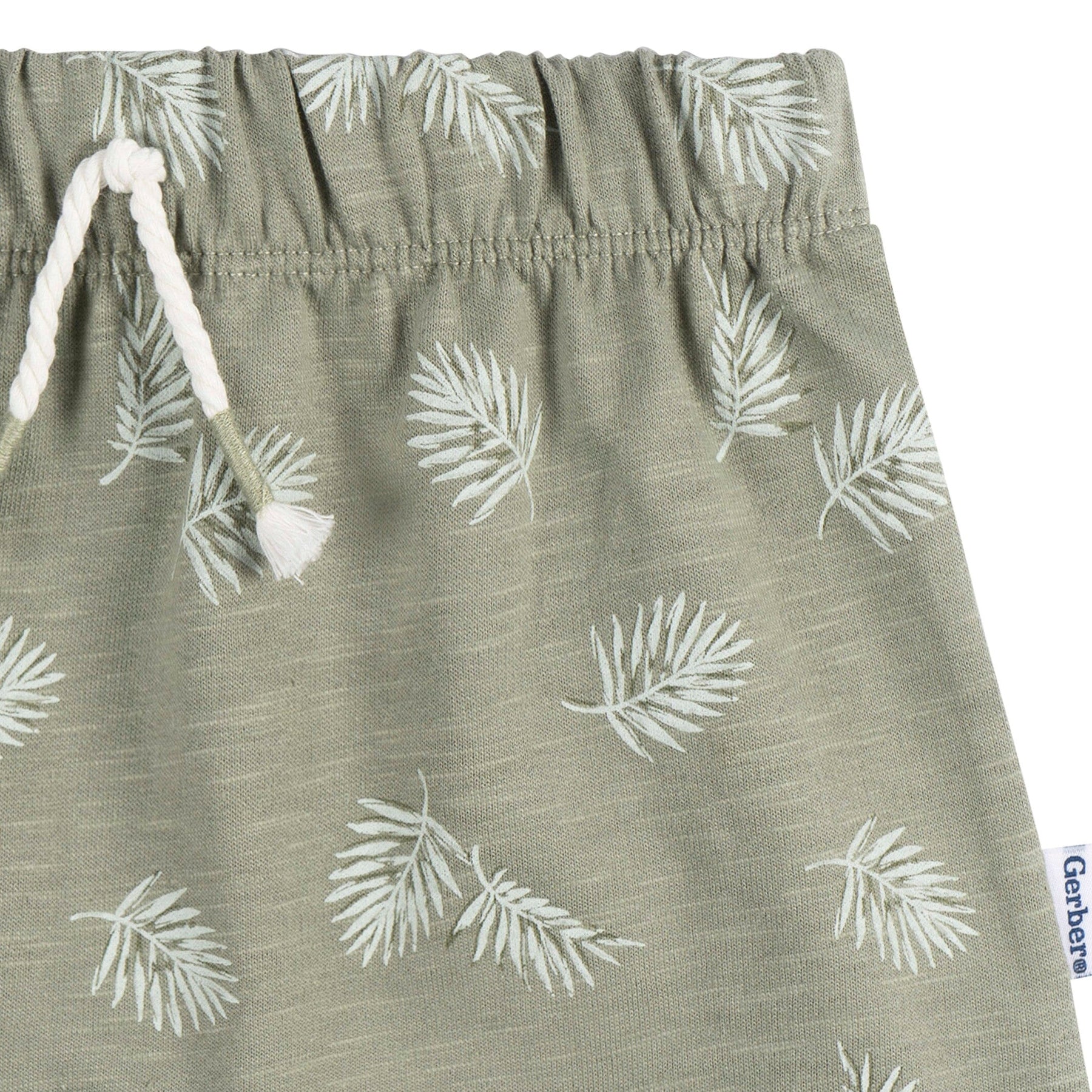 • Green with palm frond print on shorts, faux wood buttons