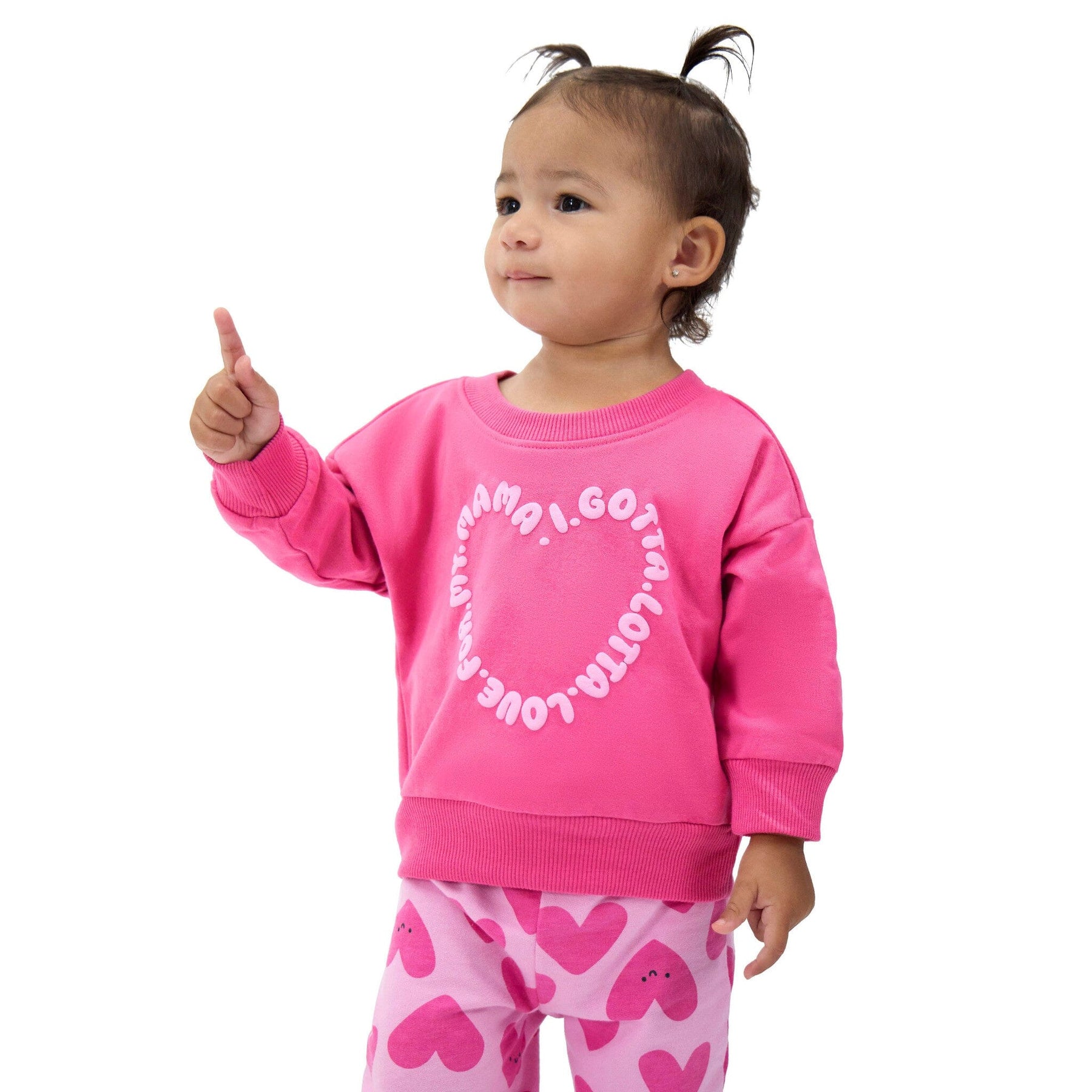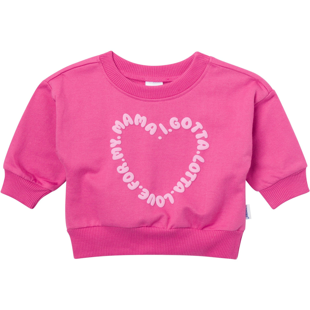 All the love, all the snuggles—our “Love Mama” set wraps your little sweetheart in soft, cozy comfort with a whole lot of heart! The sweatshirt features a bold graphic that says “I Gotta Lotta Love For My Mama” in a sweet circular print, with a roomy drop shoulder fit that’s perfect for layering. The matching heart-print pants bring the love from top to toe, and flexible ribbing keeps things comfy while baby plays, crawls, or cuddles up on cooler days. Our essentials have been independently certified with STANDARD 100 by OEKO-TEX® so that you don’t have to worry about harmful substances in your baby’s wardrobe. Includes baby girl sweatshirt and pants set.