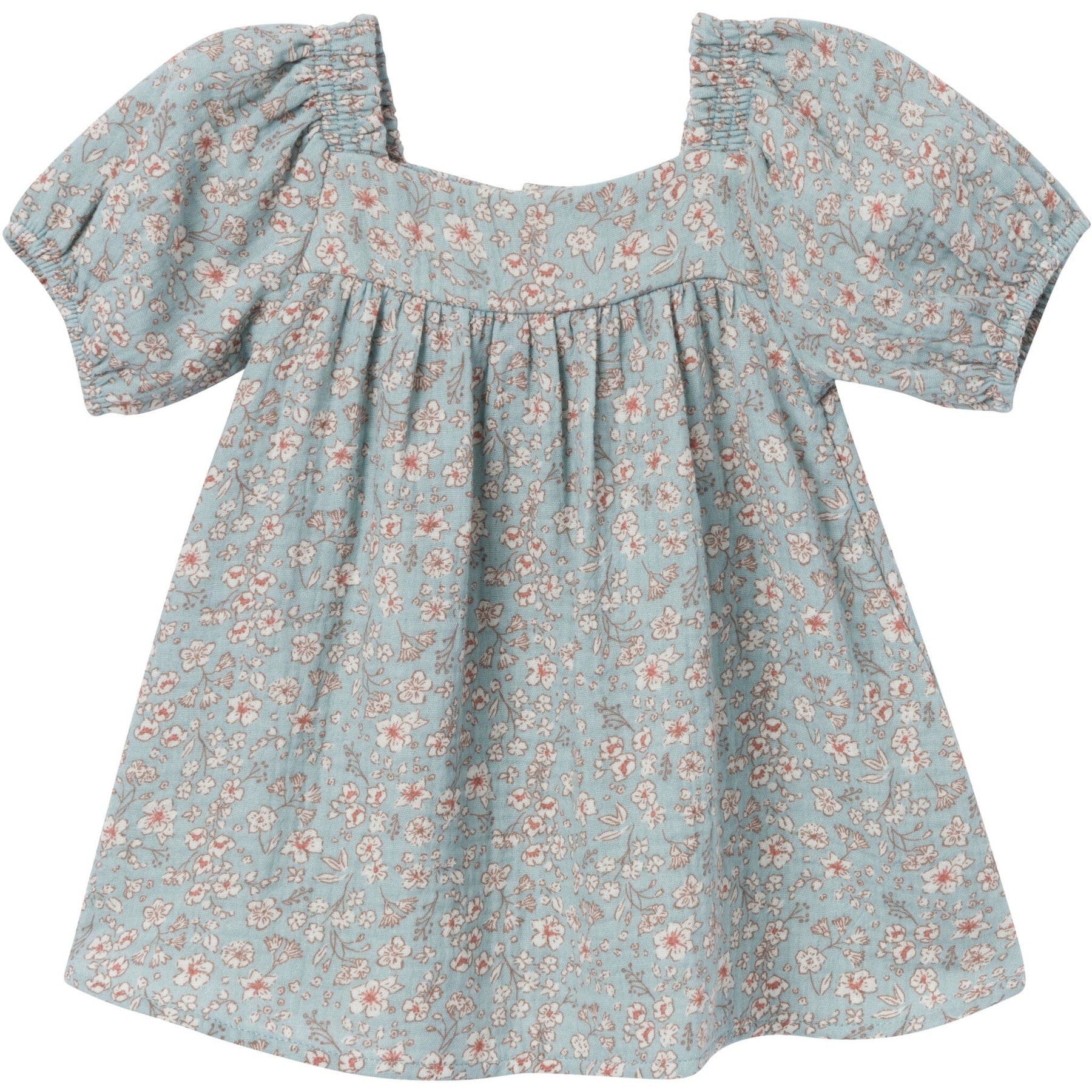 • Teal dress with multi-color flowers, stylish puffed sleeves
