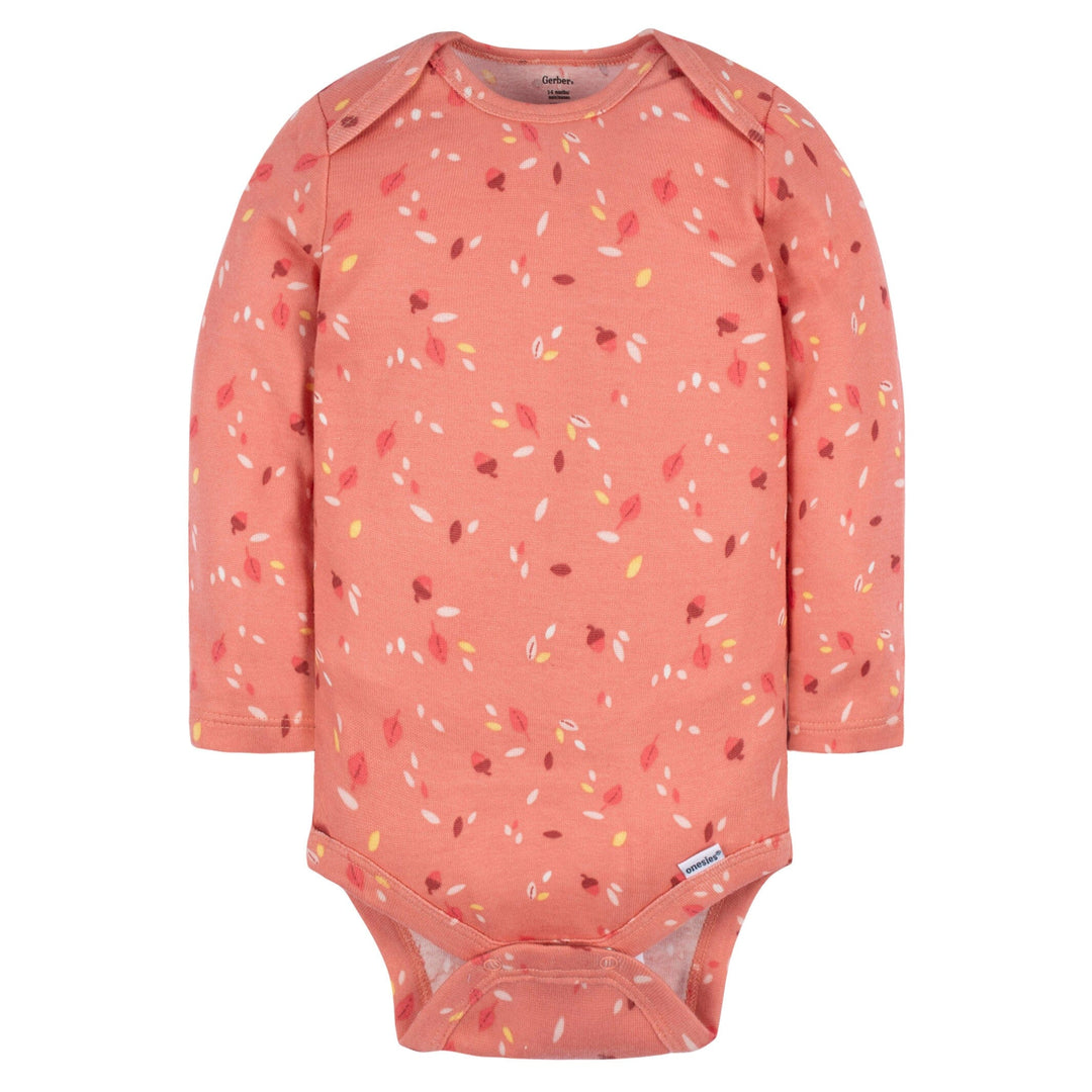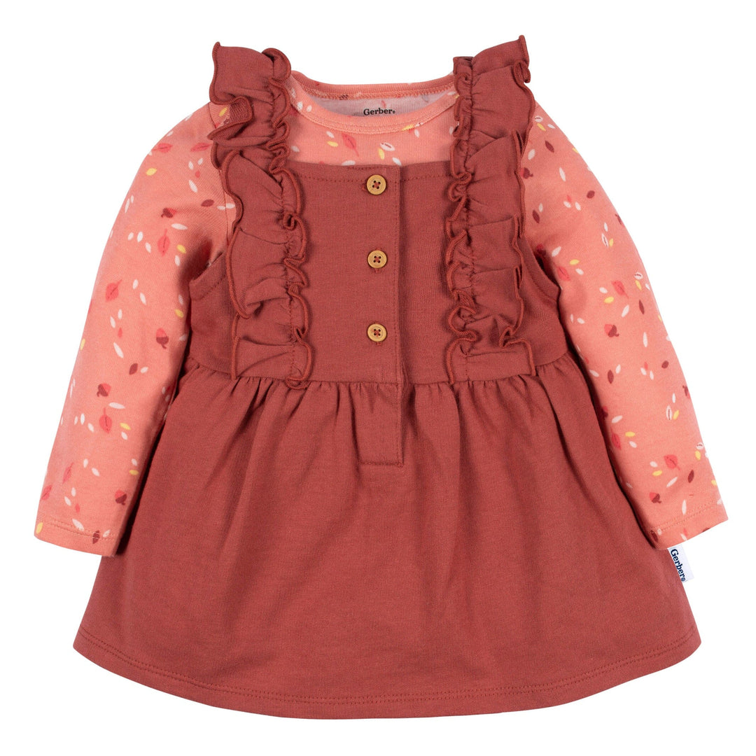 This fall themed, two-piece outfit will keep your baby girl warm and cozy all season long. Features an adorable jumper and matching, long sleeve Onesies® Brand Bodysuit for a complete look. The jumper is made from a warm cotton and polyester blend, while the bodysuit is made from a slightly stretchy cotton to be gentle on sensitive skin. Bodysuit leg snaps make diaper changes easy, while shoulder flaps enable you to simply remove the entire piece down over the legs if needed. Our essentials have been independently certified with STANDARD 100 by OEKO-TEX® so that you don’t have to worry about harmful substances in your baby’s wardrobe. This two piece set includes one orange jumper and one bodysuit with matching falling leaves pattern.