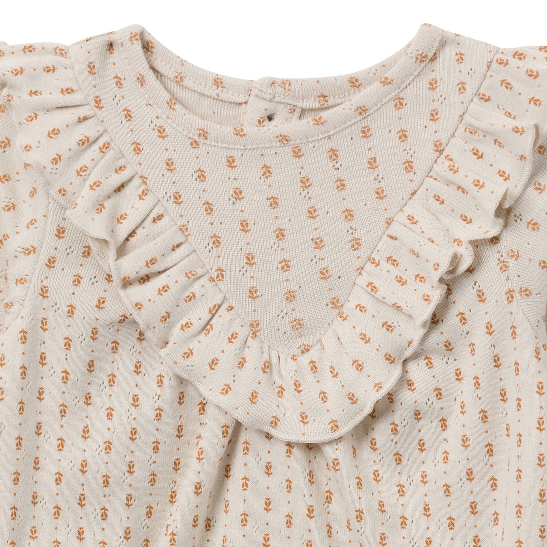 This baby girl bubble romper and tights set is thoughtfully designed for cooler days and picture-perfect moments. The long-sleeve romper features a charming V-neck ruffle and cinched wrists for a soft, secure fit. Flexible leg openings keep baby comfortable throughout the day, while easy snaps at the bottom make diaper changes simple. The matching footed tights have a comfort-stretch waistband to stay in place without pinching, making this outfit both cozy and complete. Our essentials have been independently certified with STANDARD 100 by OEKO-TEX® so that you don’t have to worry about harmful substances in your little one's wardrobe. Pack includes two-piece bubble romper and tights set from modern moments™ by Gerber®.