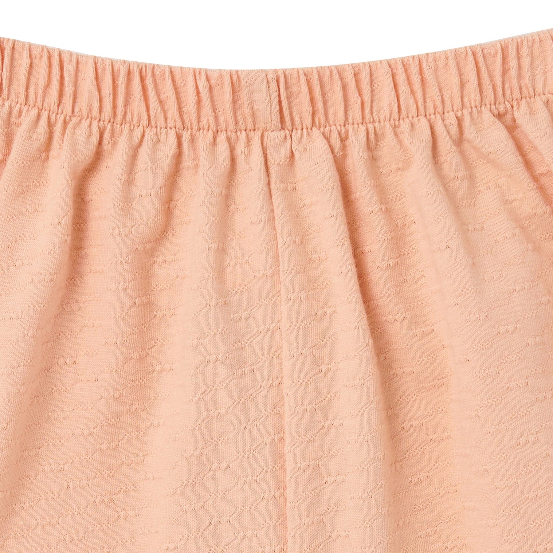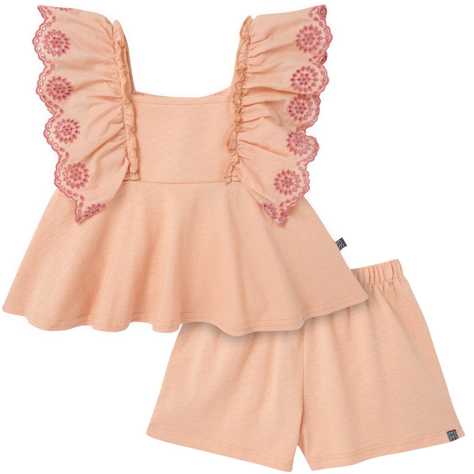 Get ready for sunshine and giggles with this charming 2-piece set! The top features playful ruffled sleeves and delicate scallop flower eyelet embroidery in a soft apricot shade, while coordinating shorts keep up with every adventure. Made entirely from 100% cotton popcorn jersey, it's breathable and wonderfully soft against sensitive skin. The shorts' comfort-stretch waistband means she can run, jump, and twirl without a care. Toss it all in the wash and tumble dry for effortless care. Our essentials have been independently certified with STANDARD 100 by OEKO-TEX® so that you don’t have to worry about harmful substances in your little one’s wardrobe.