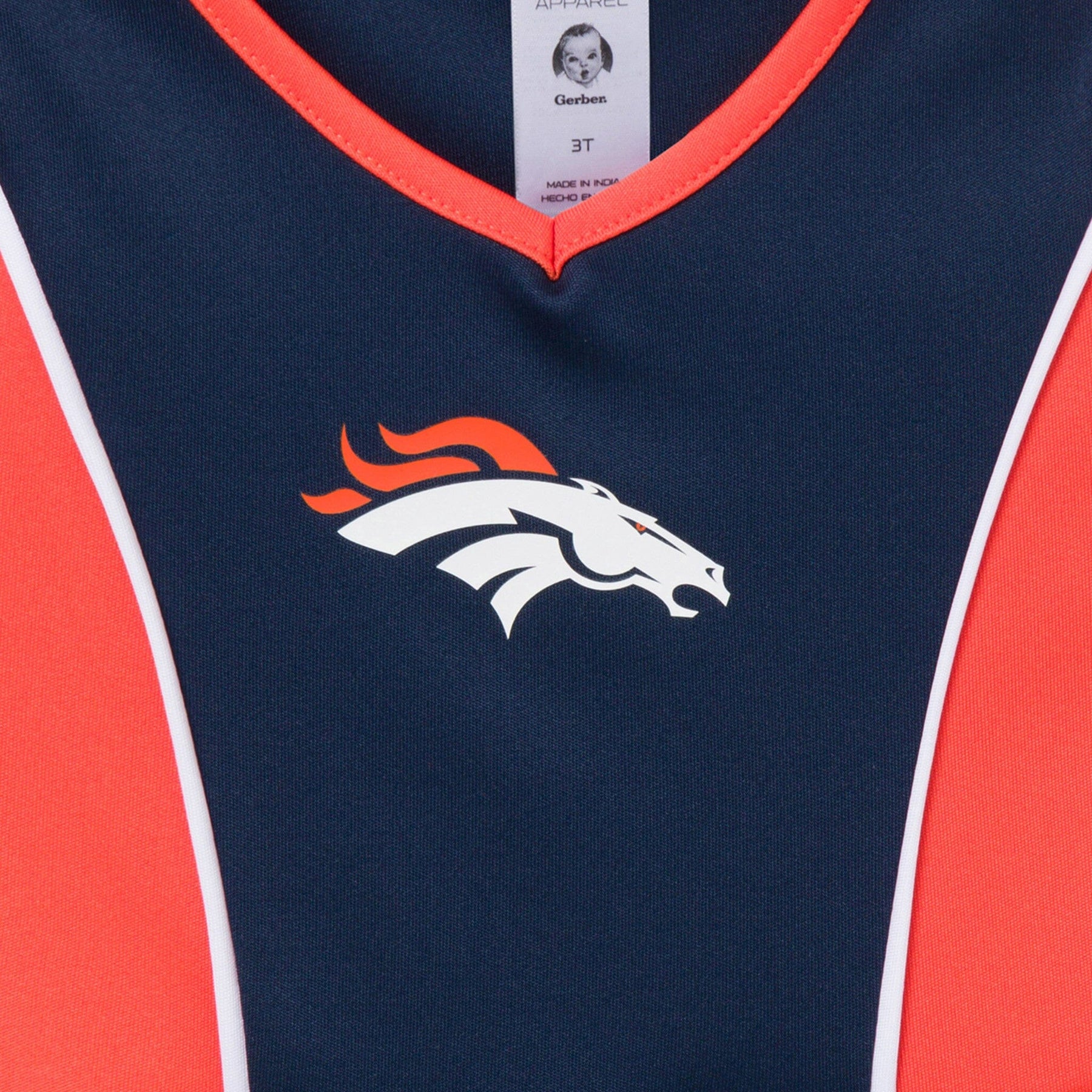 Get your little one game day ready in this spirited Denver Broncos cheer dress and diaper cover set! Made from soft and durable interlock fabric, this outfit keeps her comfy whether she’s cheering from the couch or running around at halftime. The pullover dress makes dressing easy, while the stretchy waistband and leg openings on the diaper cover ensure a snug, gentle fit. With a cheerleader-inspired design and a bold Broncos logo at the center, she’ll be showing her Denver pride in the cutest way possible. Our essentials are independently certified with STANDARD 100 by OEKO-TEX, so you don’t have to worry about harmful substances in your little one's wardrobe. Includes dress and matching diaper cover.