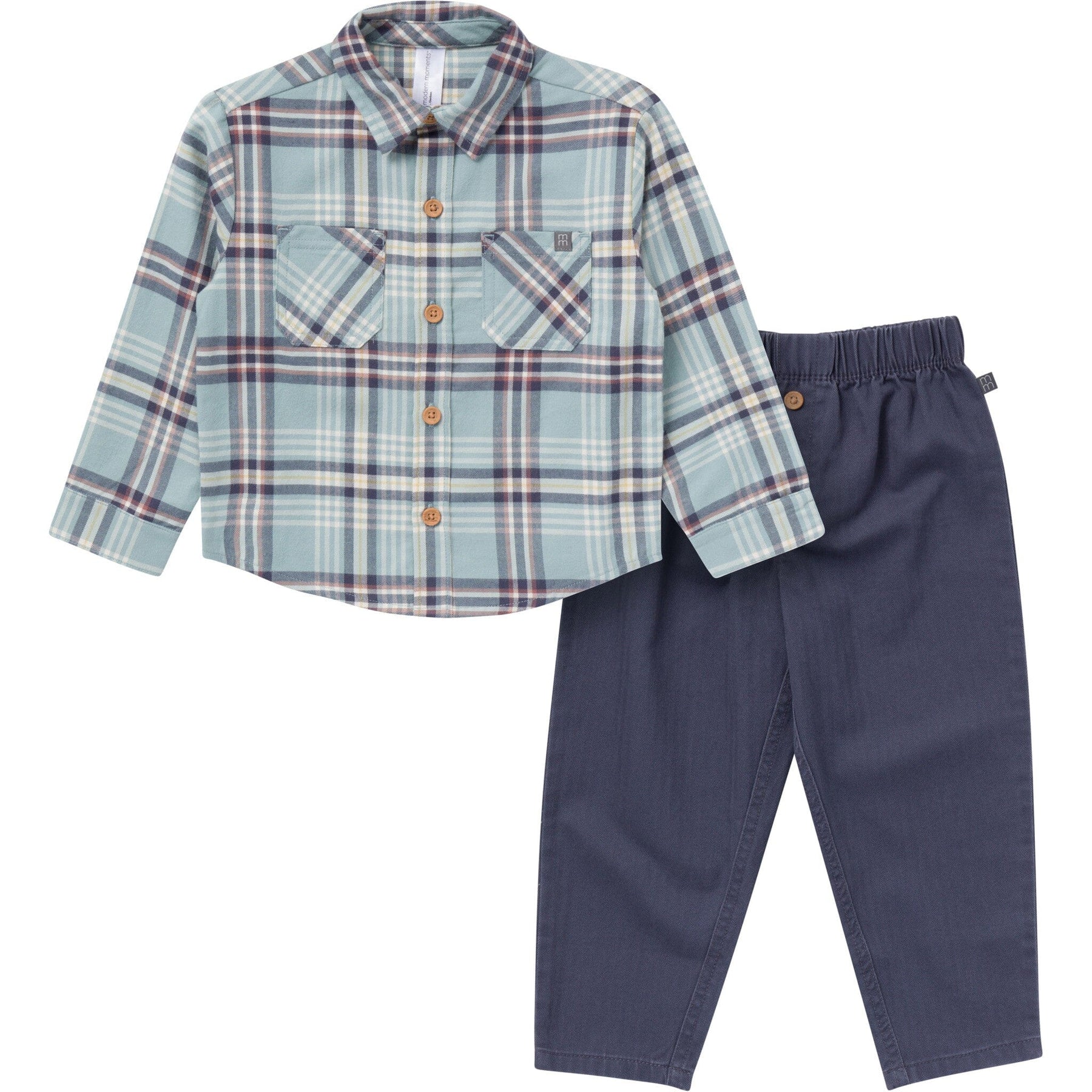 This boy’s outfit blends timeless style with cozy comfort, making it a go-to for cooler days. The flannel shirt is made from 100% cotton, offering a soft, breathable feel that’s gentle on sensitive skin. Designed with a classic collar and twin front pockets, it’s easy to layer over a tee or under a jacket for extra warmth. Paired with pants that feature a comfort-stretch waistband, this set keeps him looking polished while feeling completely comfortable from morning play to afternoon outings. Our essentials have been independently certified with STANDARD 100 by OEKO-TEX® so that you don’t have to worry about harmful substances in your little one's wardrobe. Pack includes two-piece shirt and pants set from modern moments™ by Gerber®.