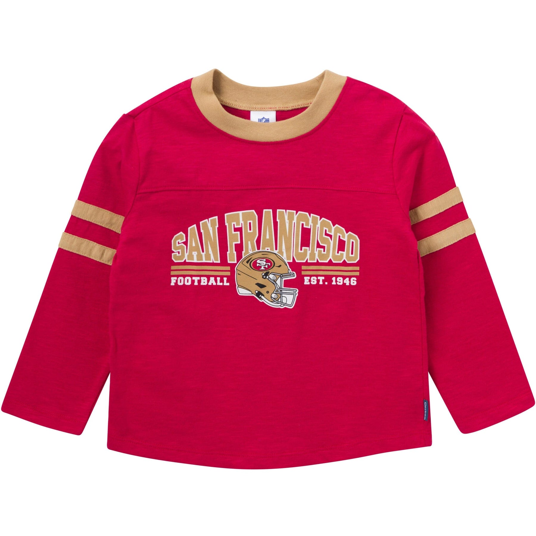 Your little Niners fan will be ready for action in this long sleeve t-shirt and sweatpants set, built with soft, durable fabric that can handle playtime fumbles and touchdowns alike. The long sleeve shirt keeps them warm on cooler days, while the jogger-style pants feature a comfort-stretch waistband and cinched ankles for a secure, flexible fit—topped off with a proud 49ers logo for extra team spirit. Our essentials are independently certified with STANDARD 100 by OEKO-TEX, so you don’t have to worry about harmful substances in your little one's wardrobe. Includes shirt and matching sweatpants.