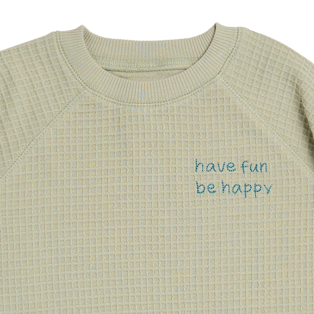 • Text on shirt reading "have fun be happy", faux drawstring on shorts