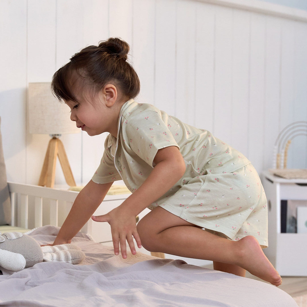 Our baby and toddler girl 2-piece pajama set is perfect for little ones who love a cute look and comfy feel! Made from soft and stretchy material, these pajamas ensure a restful night. The comfort-stretch waistband on the shorts offers a snug fit without pinching, while the soft, rounded collar provides extra comfort. Ideal for keeping cool on warmer nights, this pajama set is the perfect way to slip off to sweet dreams. Our essentials have been independently certified with STANDARD 100 by OEKO-TEX® so that you don’t have to worry about harmful substances in your baby’s wardrobe. Includes one short sleeve top with matching shorts. Flame resistant for child safety.