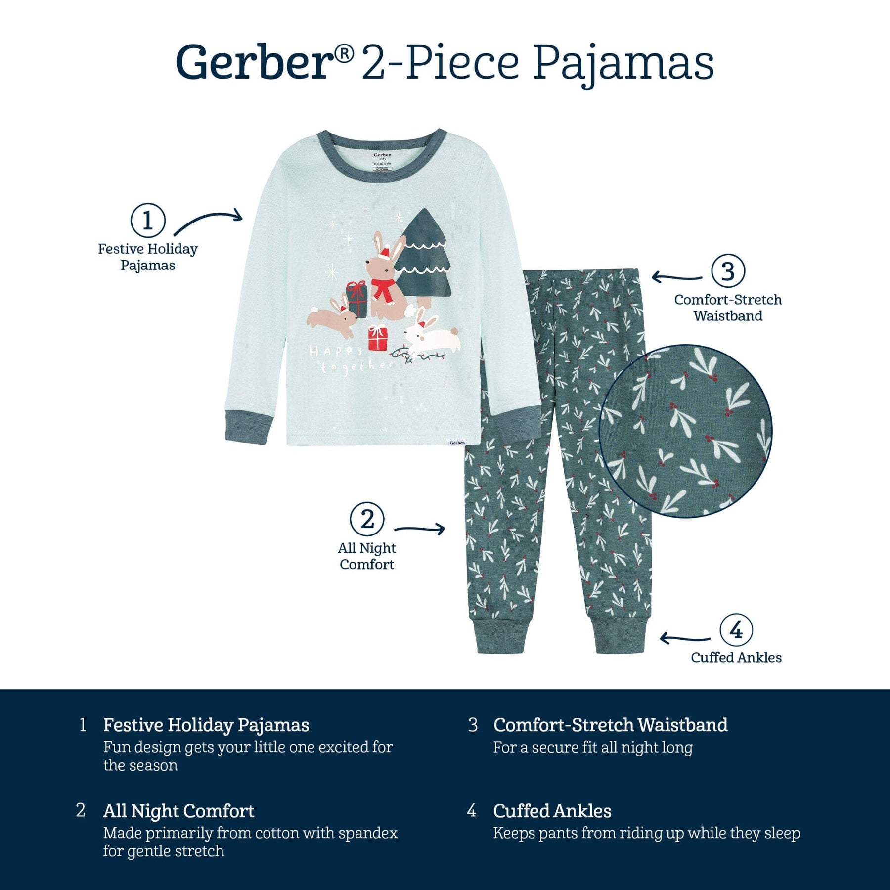 Get your little one ready for the sweetest holiday dreams in this cozy 2-piece pajama set! Made primarily from soft, durable cotton, it’s extra gentle on sensitive skin. The comfort-stretch waistband ensures a comfy fit, while cinched wrists and ankles keep everything snug and secure. Featuring a high-quality puff screen print of adorable bunnies gathered around an evergreen tree with presents, this festive set brings extra charm to bedtime cuddles and holiday morning fun! Our essentials have been independently certified with STANDARD 100 by OEKO-TEX® so that you don’t have to worry about harmful substances in your baby’s wardrobe. Pack includes pajama top and bottom.