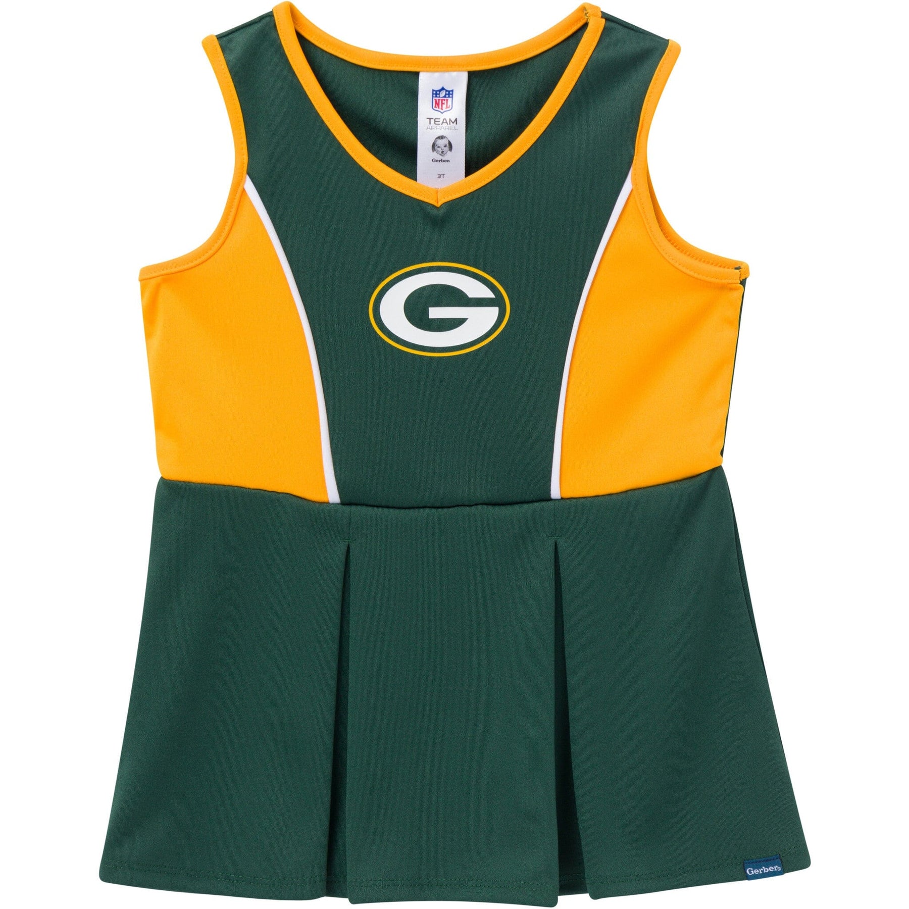 Your little Green Bay fan will be ready to cheer on the Packers in this adorable cheer dress and diaper cover set! Made from soft, stretchy interlock fabric, this outfit is comfy enough for all-day play and cheering. The pullover-style dress makes for easy dressing, while the matching diaper cover has a comfort-stretch waistband and leg openings for a secure, comfy fit. Finished with a large Green Bay Packers logo front and center, she’ll be showing her team spirit in style every game day. Our essentials are independently certified with STANDARD 100 by OEKO-TEX, so you don’t have to worry about harmful substances in your little one's wardrobe. Includes dress and matching diaper cover.