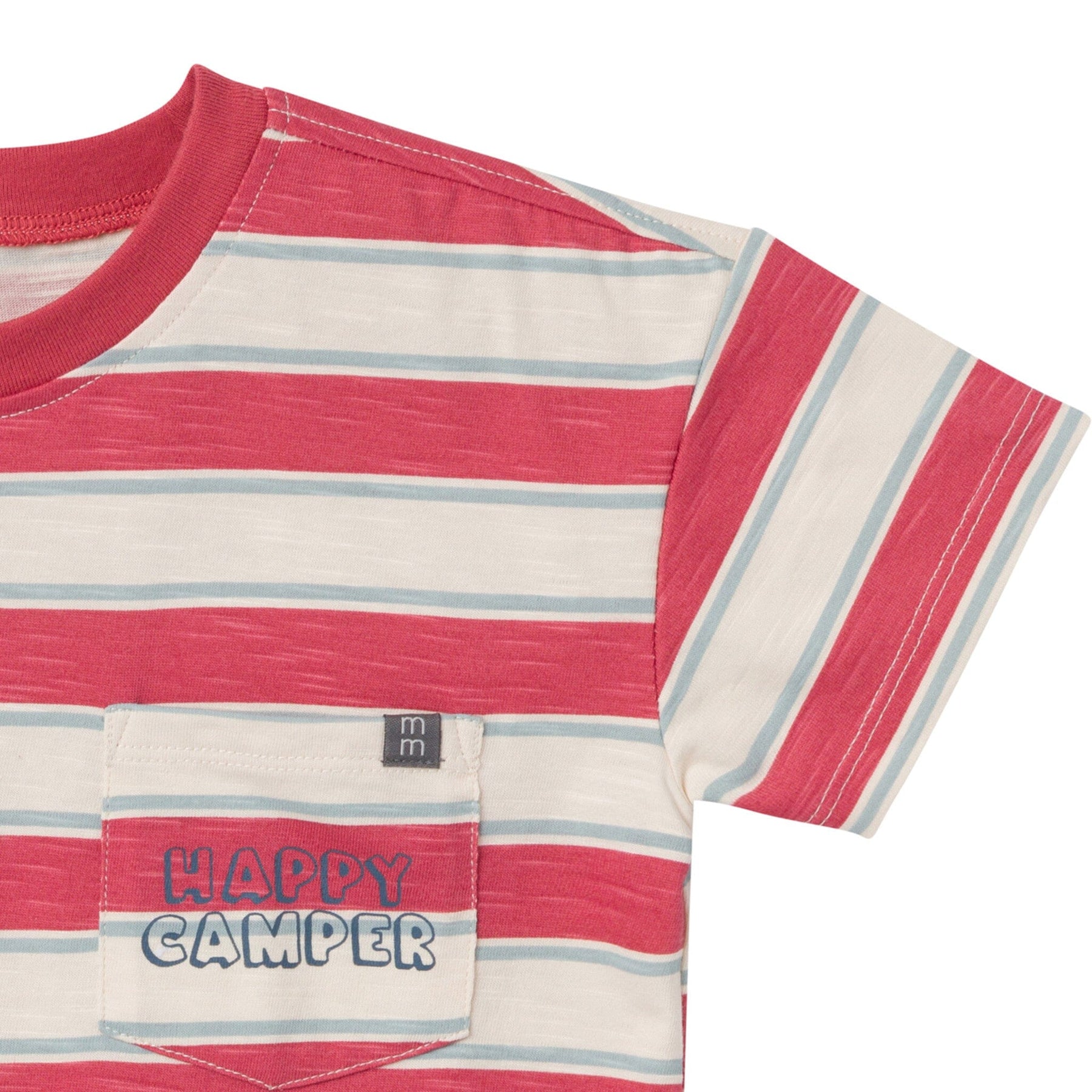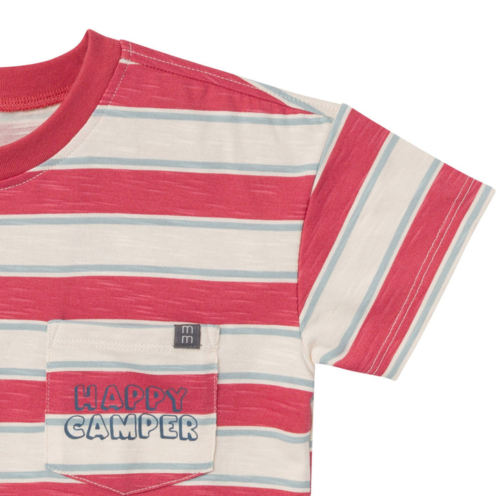 • Text on shirt pocket reading "happy camper", faux drawstring on shorts
