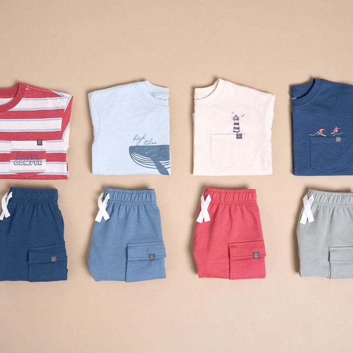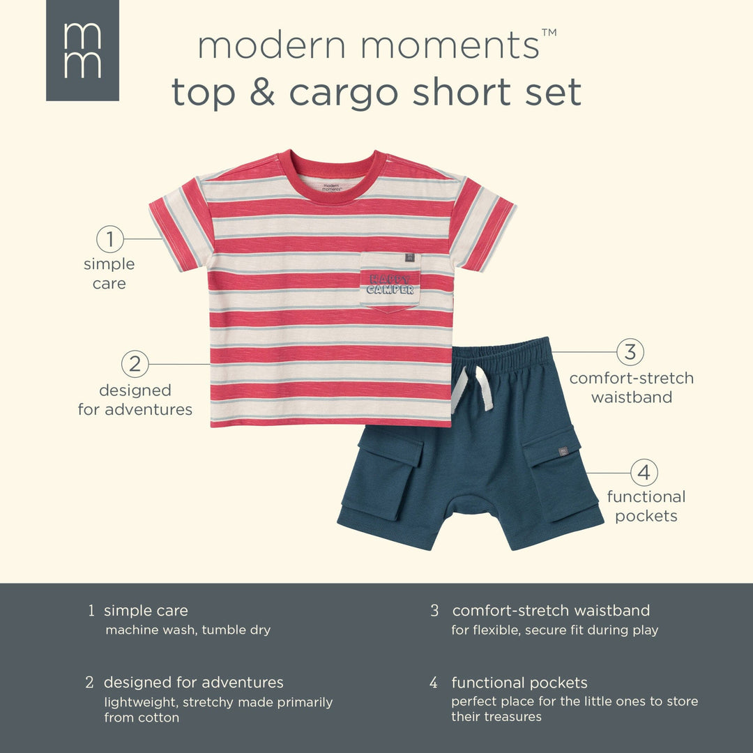 • Made primarily from cotton with spandex for a slight stretch, comfort-stretch waistband on shorts for secure fit, functional pockets on cargo shorts for his little treasures