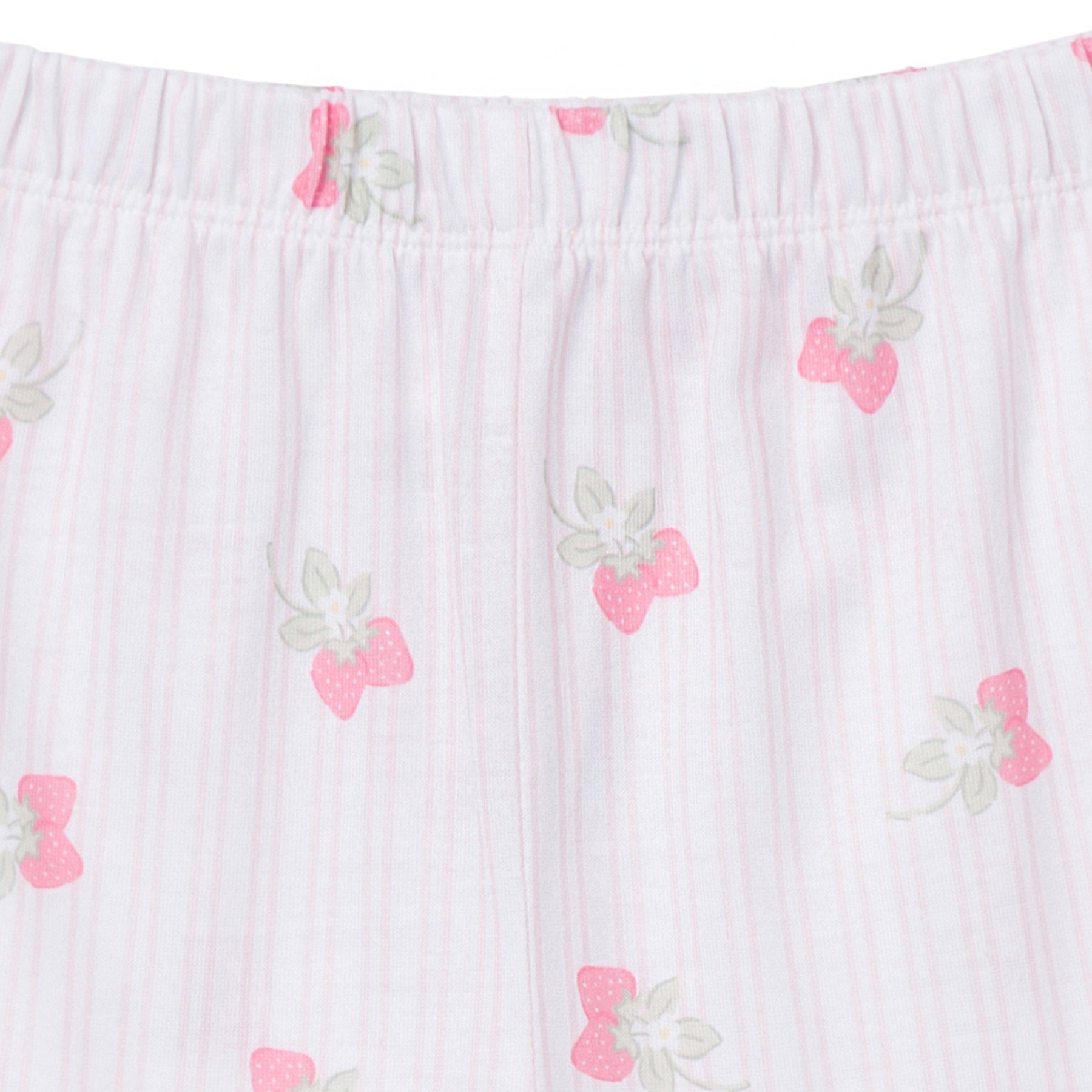 • Pink top with pink and white striped pants, text on shirt with screenprint art reading """"so berry cute""""