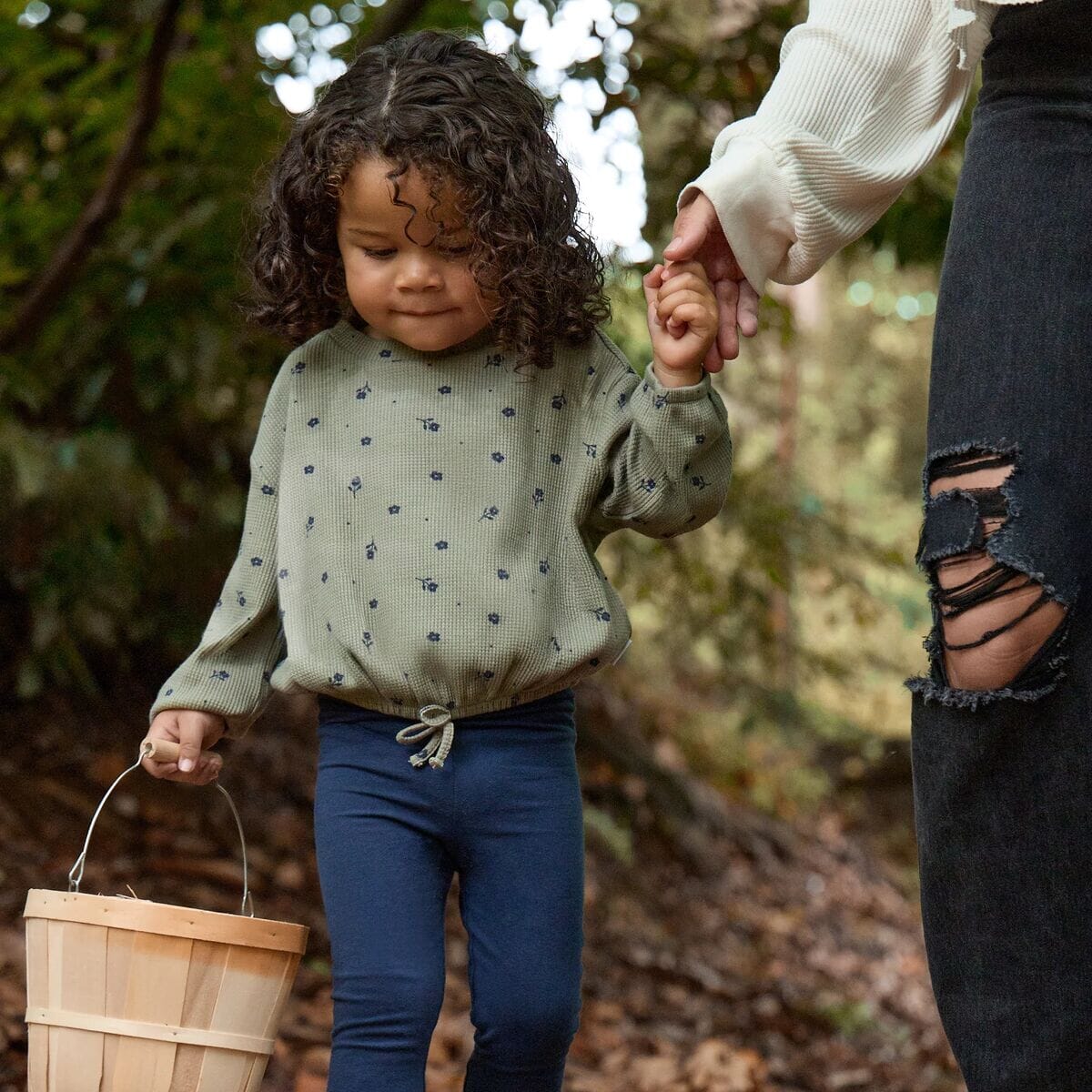 Let her twirl, run, and play in cozy comfort all season long! this toddler girl's fall outfit is made from soft, stretchy fabric that moves with her, perfect for playdates and pumpkin patch days. The long sleeve top and comfy leggings are made for cool-weather fun, with elastic at the waist and sleeves for easy dressing. A comfort-stretch waistband on the leggings keeps her comfy all day, and thoughtful details like a sweet bow on the shirt hem and lettuce edge trim on the leggings add the cutest finishing touches. Our essentials have been independently certified with STANDARD 100 by OEKO-TEX® so that you don’t have to worry about harmful substances in your little one’s wardrobe. Includes matching top and bottom.