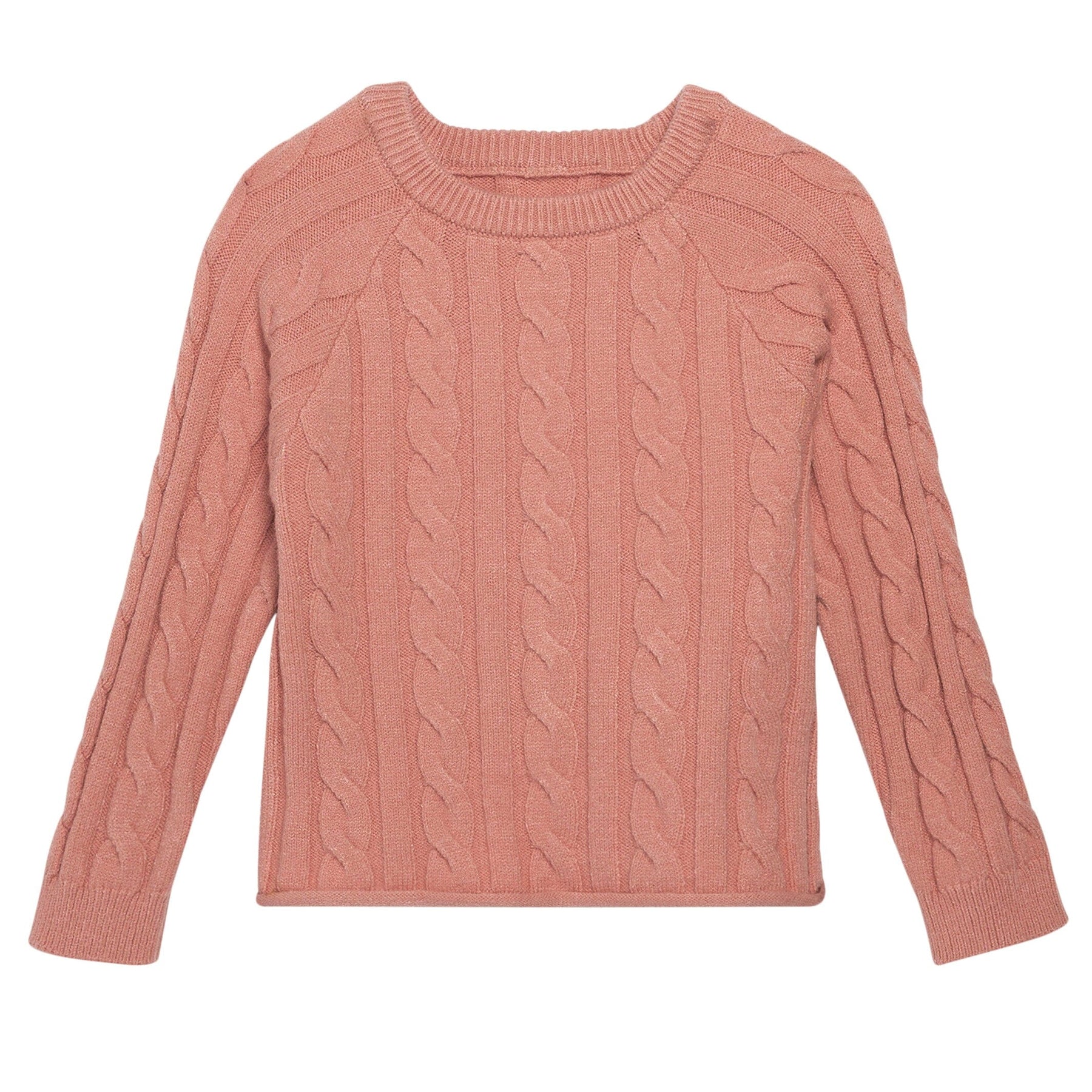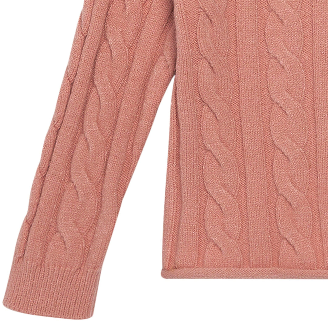 • Solid peach color outfit, cable knit styling on sweater top