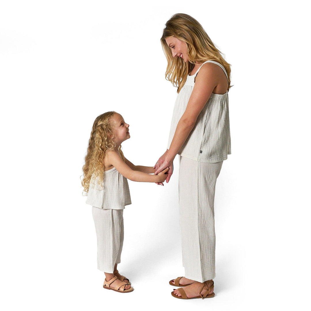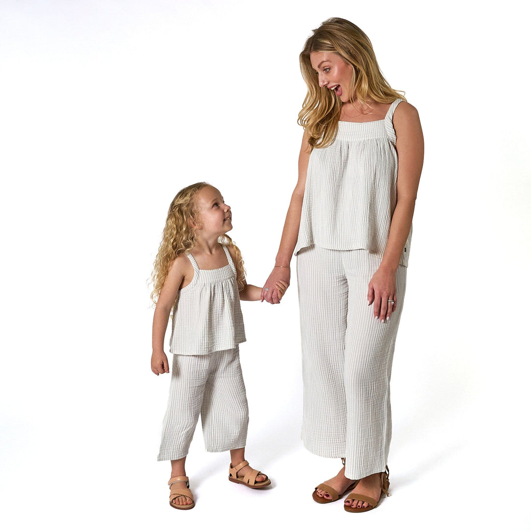 Stay stylish and cool in this trendy outfit! Made from 100% cotton gauze, the fabric is lightweight and breathable for those sunny days out. The sleeveless top features a playful ruffled bottom and crisscross straps at the back, and the wide-leg pants with a comfort-stretch waistband offer a flowy, relaxed fit. For an extra dose of fun, match it with your little girl’s outfit for an effortlessly cute Mommy and Me look! Our essentials have been independently certified with STANDARD 100 by OEKO-TEX® so that you don’t have to worry about harmful substances in your wardrobe. Pack includes one shirt with matching pants.