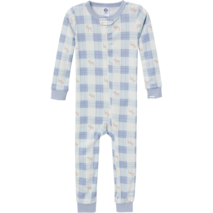Your baby or toddler can settle into cozy sleep after a day full of adventure and play with their pick from this 3 pack of pajamas. Made primarily from soft cotton, they offer a breathable feel that keeps your little one snug and content all night long. The set features an outdoors theme with designs including a charming moose print, classic plaid, and evergreen trees, perfect for young nature enthusiasts. Each pajama includes a convenient two-way zipper with a neckline guard for easy dressing and quick diaper changes, while the spandex trim at the neckline and wrists ensures a flexible, secure fit. With a tight-fitting style for safety and warmth, these pajamas blend comfort and style, making bedtime fun and comfortable. Our essentials have been independently certified with STANDARD 100 by OEKO-TEX® so that you don’t have to worry about harmful substances in your baby’s wardrobe. Pack includes three snug fitting footless pajamas.