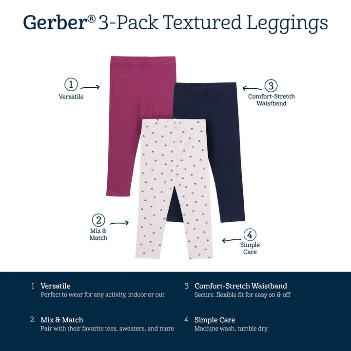 Keep her looking adorable and feeling cozy with this sweet 3-pack of baby and toddler girl textured leggings. With a dainty bow print on blush pink, deep blue, and a rich berry hue, this set brings together soft color and playful pattern in a perfectly coordinated trio. Designed with a subtle ribbed texture, these leggings add a playful touch to her everyday essentials. Our essentials have been independently certified with STANDARD 100 by OEKO-TEX® so that you don’t have to worry about harmful substances in your little one’s wardrobe. Includes three leggings.