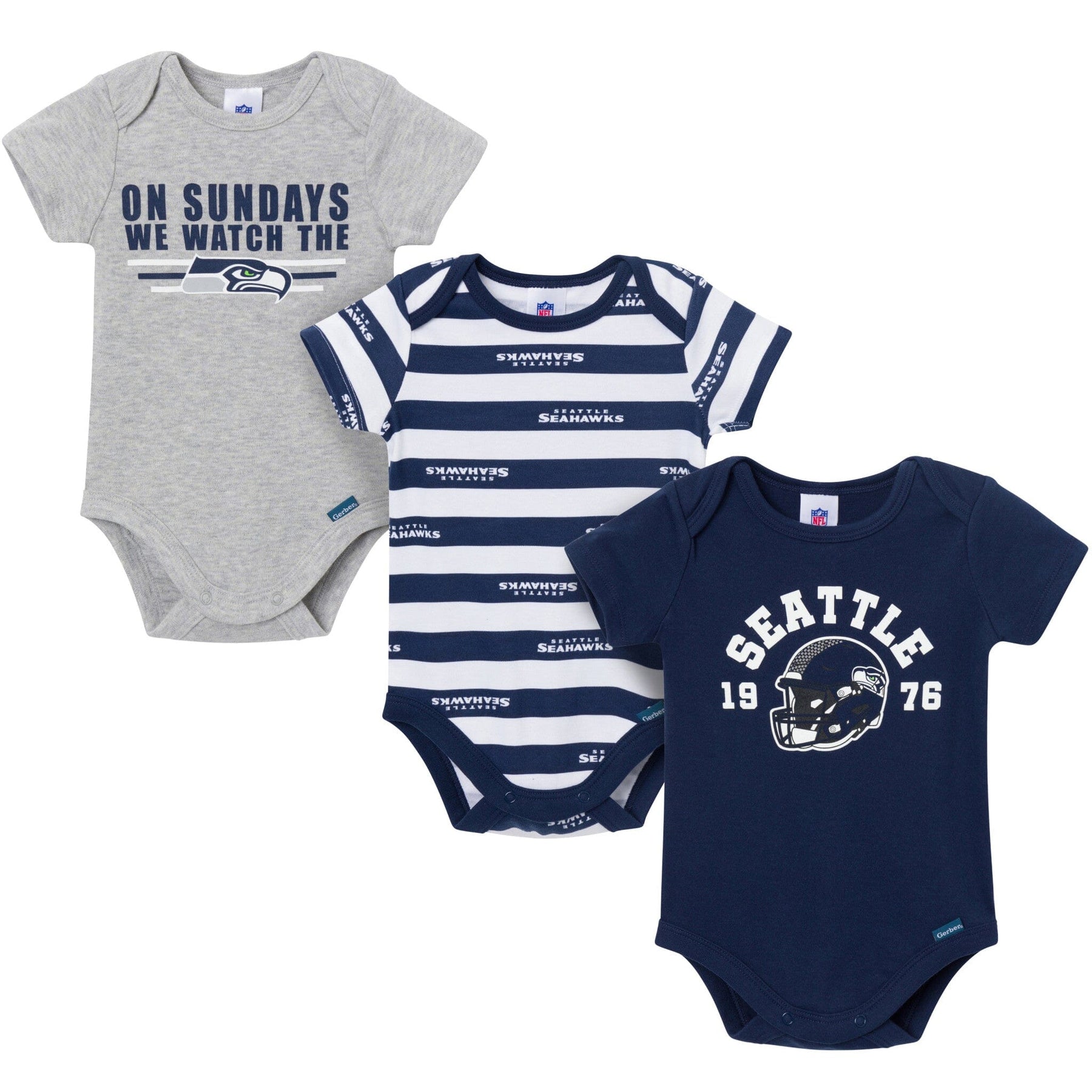 Show off your little Seahawks fan’s team pride with these comfy bodysuits! Designed with stretchy ribbed trim at the neckline and leg openings, they provide a snug yet flexible fit, letting your baby move freely while cheering for their favorite team. This 3-pack is a must-have for tiny fans who are ready to take game day to the next level in cozy comfort and bold Seahawks spirit! Our essentials independently certified with STANDARD 100 by OEKO-TEX so that you don’t have to worry about harmful substances in your little one's wardrobe. Includes three baby boy bodysuits.