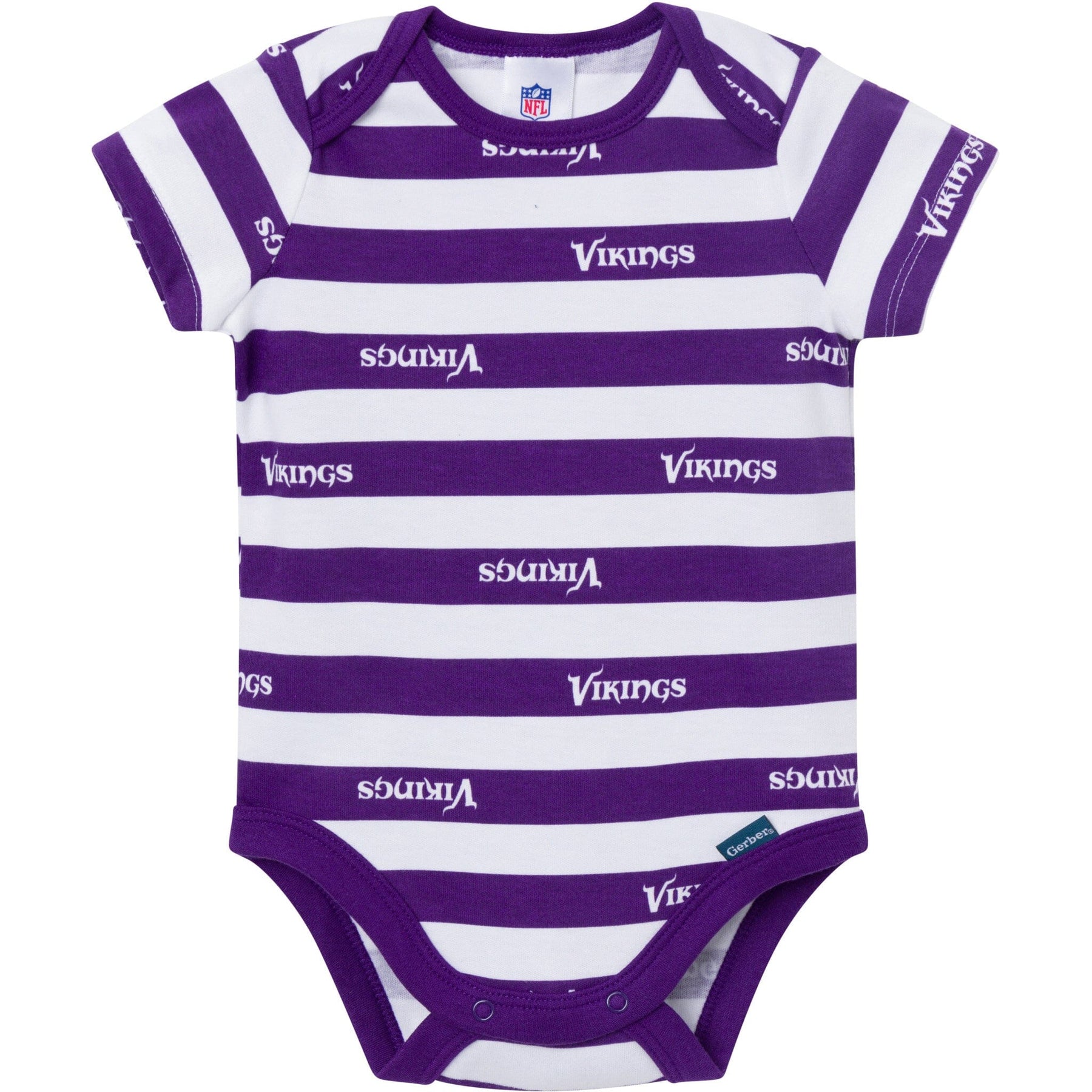 Make sure your little Vikings fan is the cutest supporter in town with these comfy bodysuits! Featuring a lap shoulder neckline for easy dressing and leg snaps that make diaper changes a breeze, these bodysuits are perfect for every game day celebration or casual playdate. Whether you're cheering for the Vikings at the stadium or from the comfort of your home, your baby will be rocking their team pride in adorable style! Our essentials have been independently certified with STANDARD 100 by OEKO-TEX so that you don’t have to worry about harmful substances in your little one's wardrobe. Includes three baby boy bodysuits.