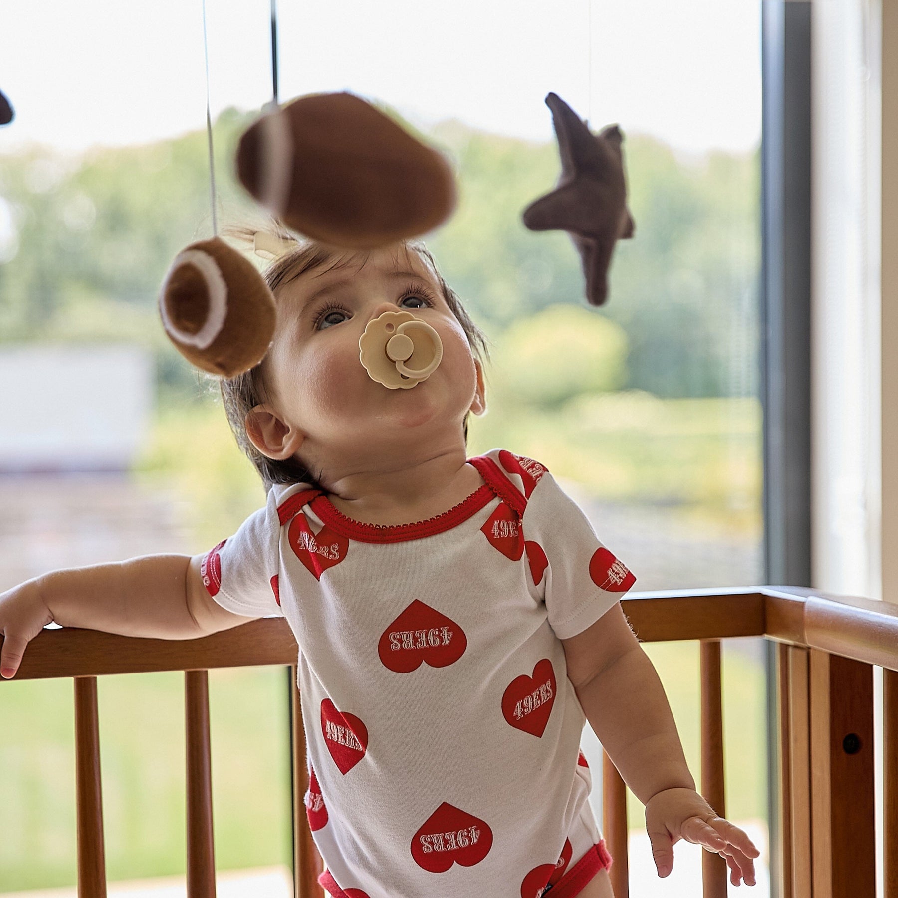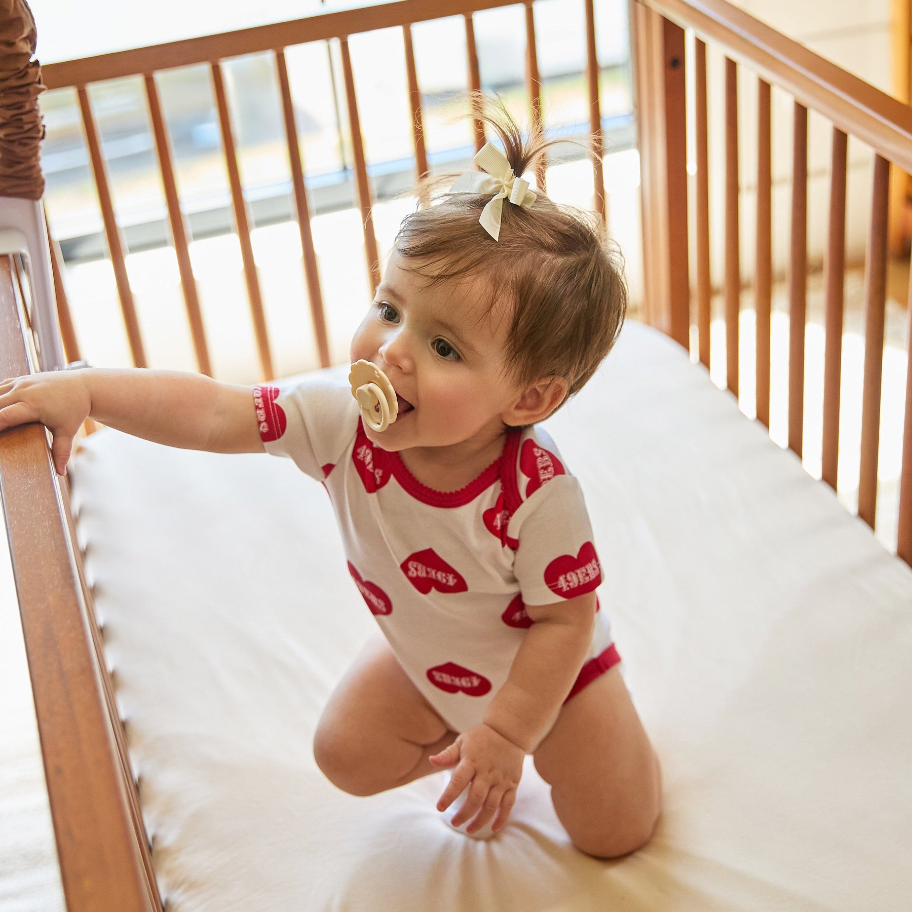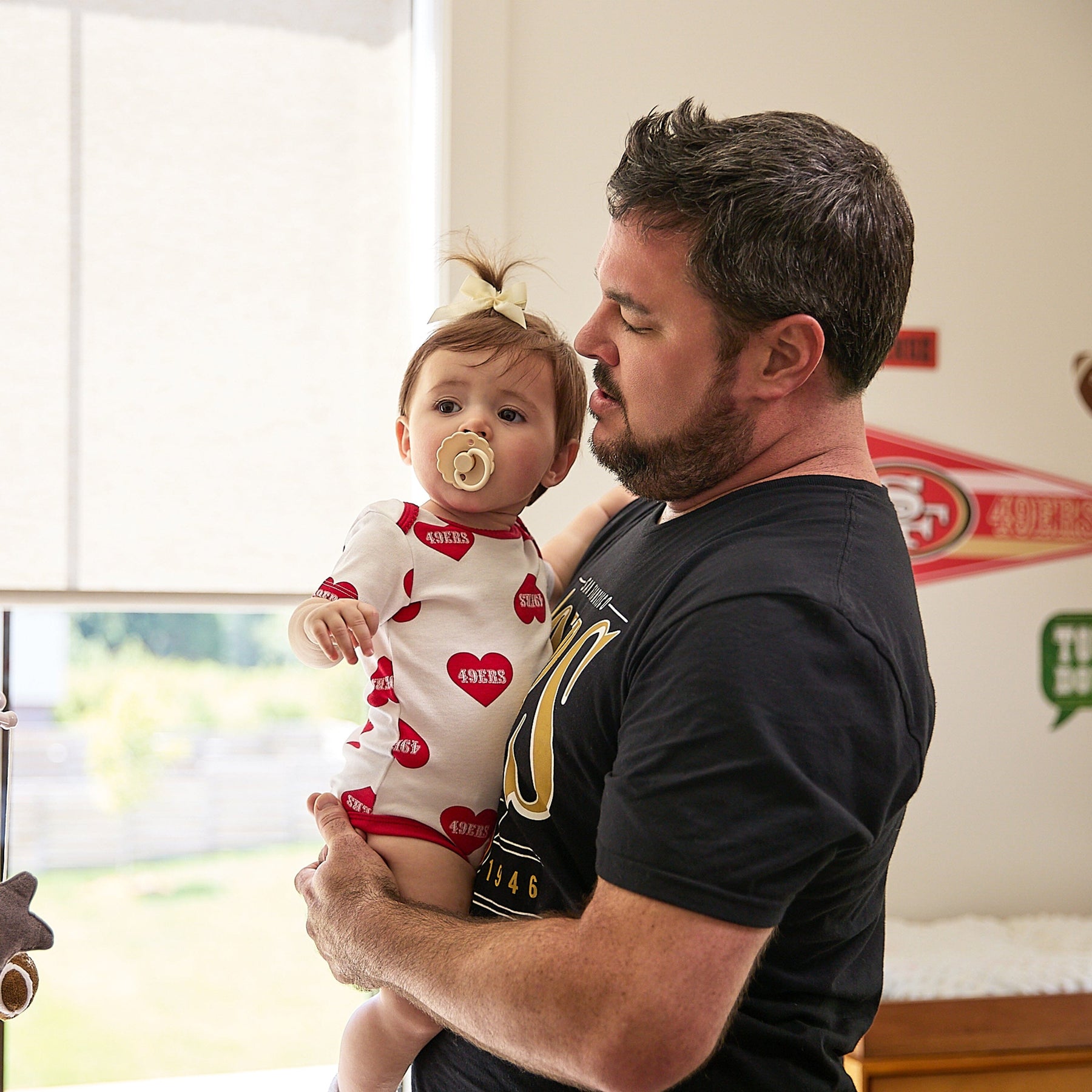 Show off your little one's 49ers spirit in adorable style! These soft and comfy bodysuits are made from a smooth, slightly stretchy fabric with a thick, durable feel—perfect for playtime, tummy time, and everything in between. The lap shoulder neckline makes dressing easy, while the leg snaps allow for quick diaper changes. Stretchy ribbing at the neckline and leg openings keeps up with wiggles and giggles. Featuring charming 49ers-themed artwork with hearts, this 3-pack is a winning choice for tiny fans! Our essentials have been independently certified with STANDARD 100 by OEKO-TEX so that you don’t have to worry about harmful substances in your little one's wardrobe. Includes three baby girl bodysuits.
