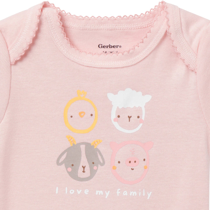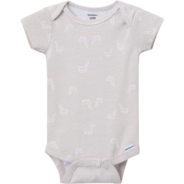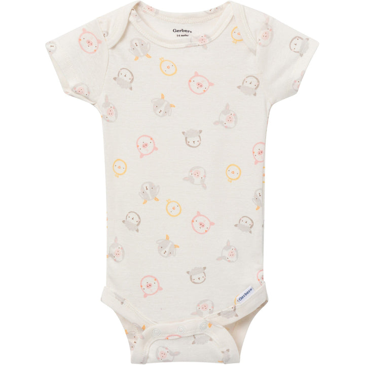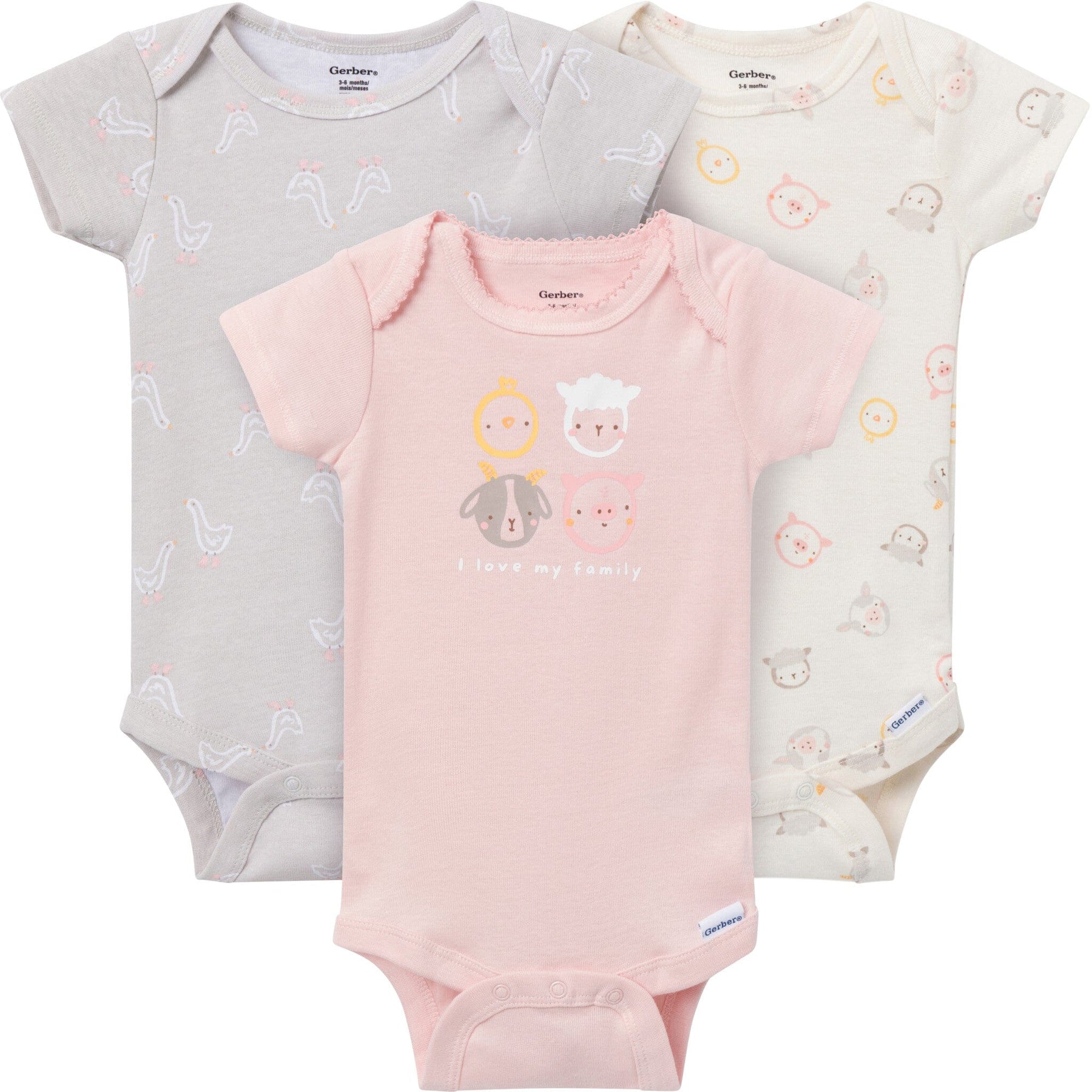 Your little one will be ready for a barnyard adventure with this 3-pack of Onesies® bodysuits! Decorated with adorable farm animal prints featuring geese, goats, chickens, and sheep, these bodysuits bring playful charm to everyday wear. Crafted from 100% soft cotton, they’re gentle on baby’s sensitive skin. The lap shoulder neckline makes it easy to pull the bodysuit off over tiny legs, and the flexible ribbing at the neckline and leg holes ensures a snug and comfy fit. With snaps for quick dressing and diaper changes, these bodysuits are both cute and practical for busy parents! Our essentials have been independently certified with STANDARD 100 by OEKO-TEX® so that you don’t have to worry about harmful substances in your little one's wardrobe. Pack includes three short sleeve Onesies® bodysuits.