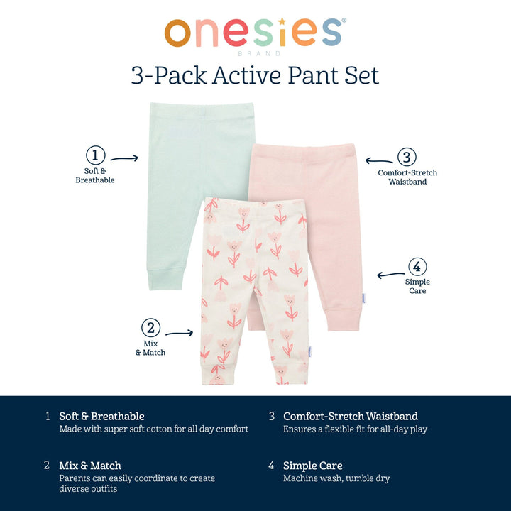 Say hello to your new favorite outfit-makers! These pants are made from 100% cotton for breathable softness that's kind to even the most sensitive skin. The comfort-stretch waistband and cinched ankles ensure a snug, stay-in-place fit — no sagging or slipping while they explore the world! With sweet styles like white sprinkled with pink flowers and solid light pink and blue options, you’ll have endless adorable combos at your fingertips. Our essentials have been independently certified with STANDARD 100 by OEKO-TEX® so that you don’t have to worry about harmful substances in your baby’s wardrobe. Includes three pants.