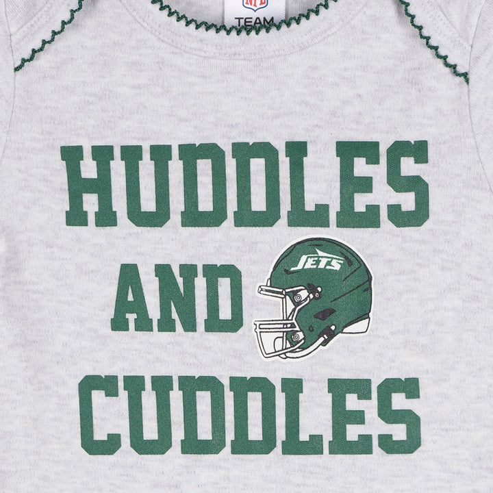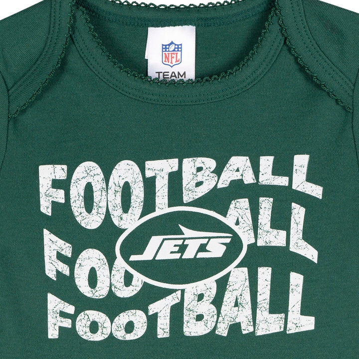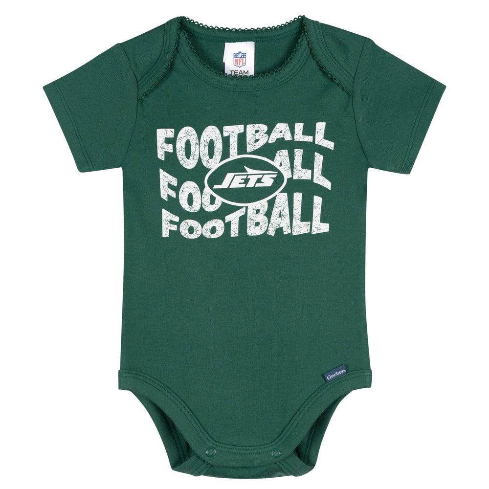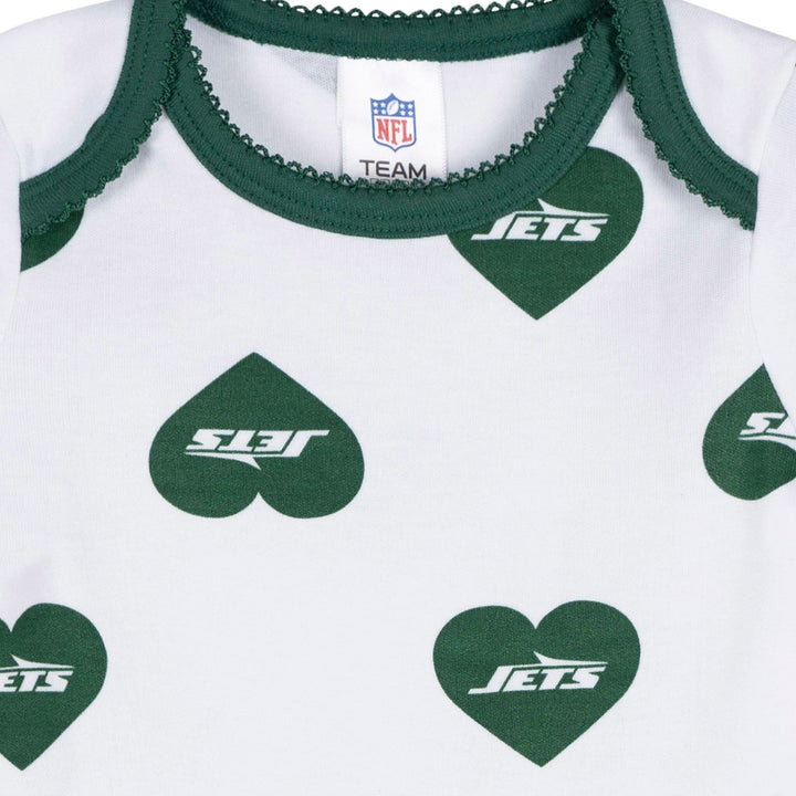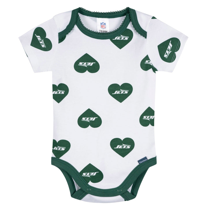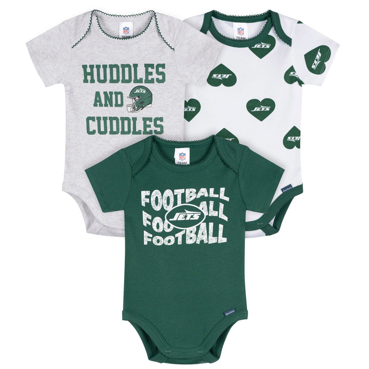 Your little one will be ready to take flight with these Jets-themed bodysuits! Soft, smooth, and slightly stretchy, they’re designed with a thick, durable feel to keep up with everyday adventures. A lap shoulder neckline makes dressing simple, while leg snaps ensure easy diaper changes. Stretchy ribbing at the neckline and leg openings provides a flexible, comfy fit. With heart-filled Jets graphics, this 3-pack is a touchdown for tiny fans! Our essentials have been independently certified with STANDARD 100 by OEKO-TEX so that you don’t have to worry about harmful substances in your little one's wardrobe. Includes three baby girl bodysuits.