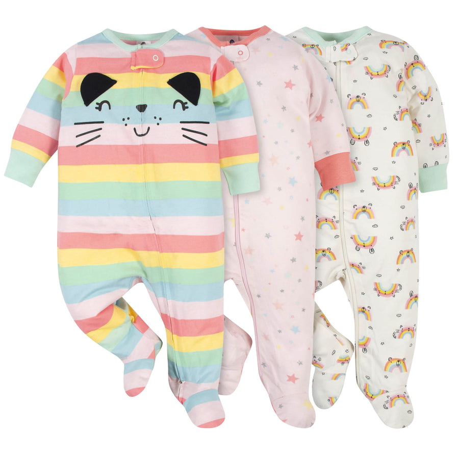 Sleep, play, eat, repeat! Our Sleep ‘N Plays are the ultimate loungewear and are made to keep baby comfy all day (or all night!) while they do what they do best. They’re easy to change, easy to clean, and totally adorable. We use STANDARD 100 by OEKO-TEX® certification on products tested in an independent laboratory against a list of more than 400 harmful substances, including PFAS. This pack includes three rainbow themed sleep 'n plays.