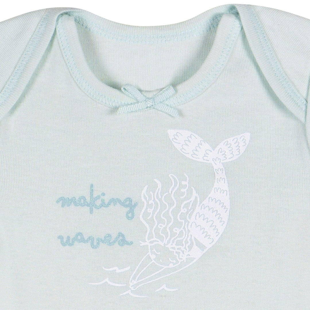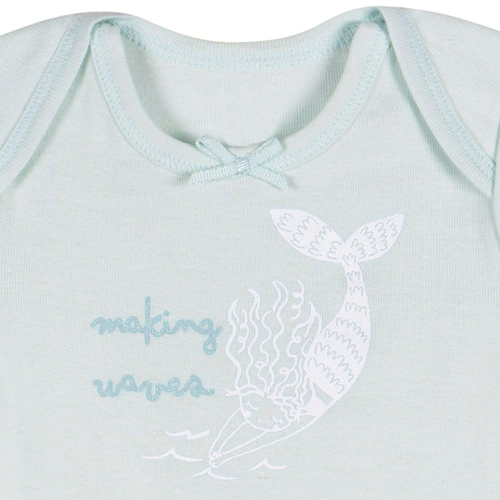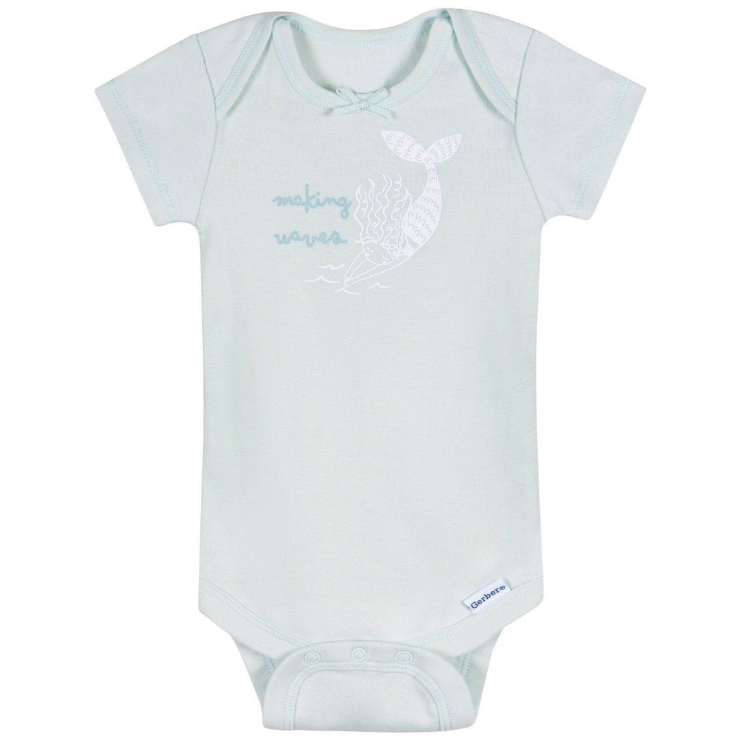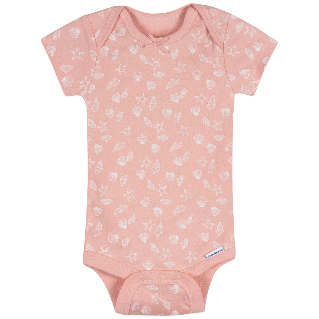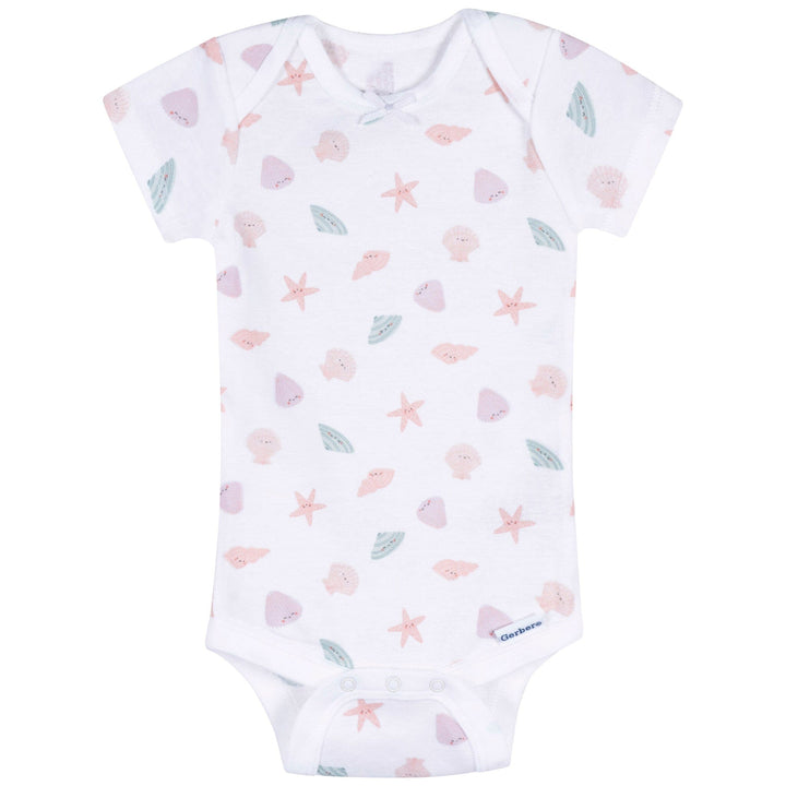 Dive into adorable style with this enchanting three-pack of baby girl short sleeve Onesies® bodysuits! Made from 100% cotton, these bodysuits are soft, breathable, and gentle on delicate skin, perfect for all-day comfort. Thoughtfully designed with convenient leg snaps and lap shoulder necklines, they make dressing and diaper changes a breeze. The short sleeve style is ideal for sunny day fun, keeping your little one cool and comfy. Featuring a delightful pink, blue, and white color scheme with charming seashell and mermaid-themed prints, this set is perfect for your little sea explorer's everyday adventures! Our essentials have been independently certified with STANDARD 100 by OEKO-TEX® so that you don't have to worry about harmful substances in your baby's wardrobe. This pack includes three Onesies® bodysuits.