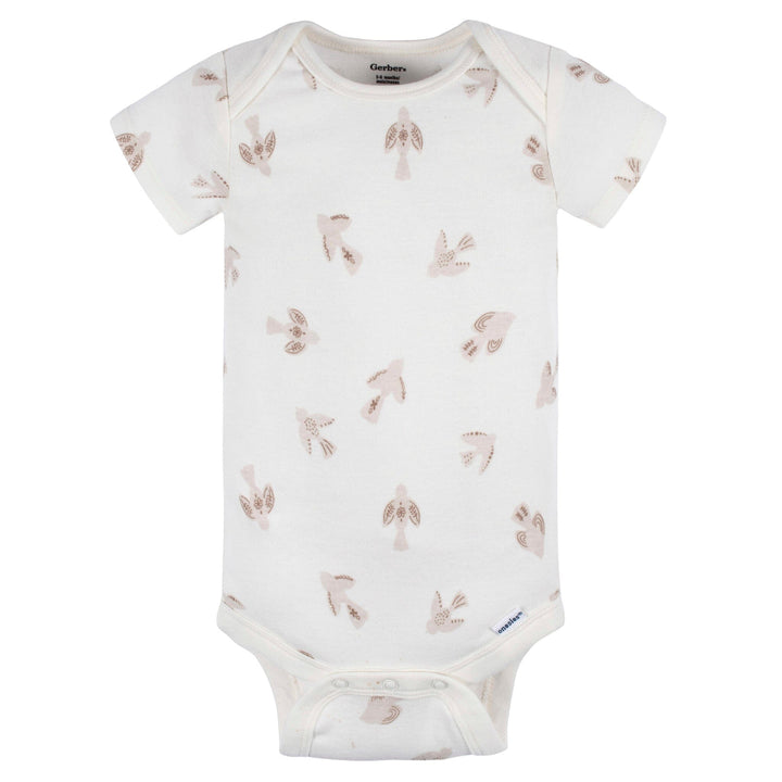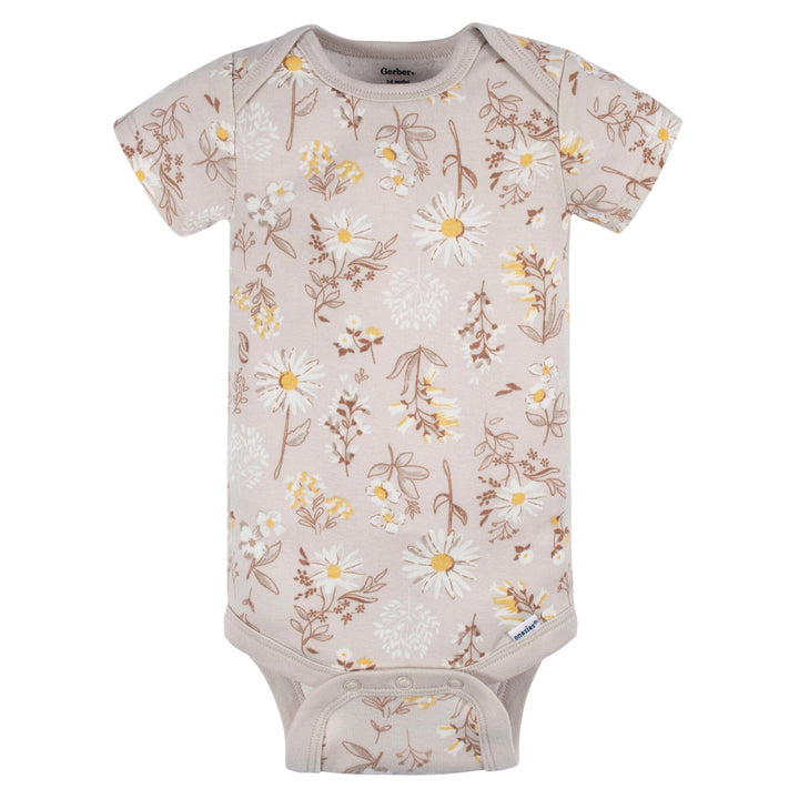 Gear up for everyday adventures with this delightful three-pack of baby girl short sleeve Onesies® bodysuits! Crafted from 100% cotton, these bodysuits are soft and gentle on your little one's sensitive skin, providing all-day comfort. Designed with convenient leg snaps and lap shoulder necklines, they make outfit changes and diaper swaps quick and easy. The short sleeve style is perfect for sunny day fun, keeping your baby cool and comfy. Featuring a charming white and taupe color scheme with floral prints! Our essentials have been independently certified with STANDARD 100 by OEKO-TEX® so that you don't have to worry about harmful substances in your baby's wardrobe. This pack includes three Onesies® bodysuits.