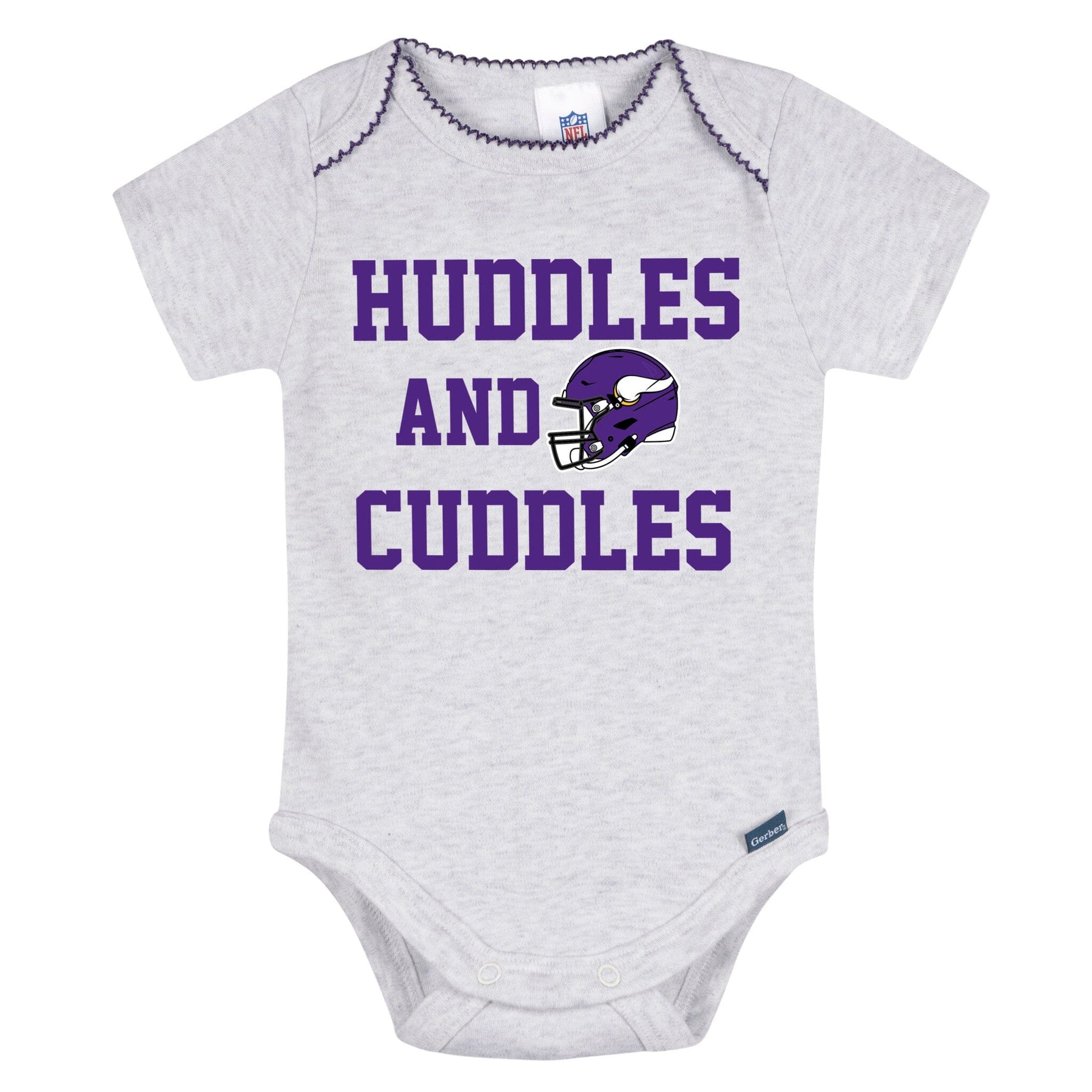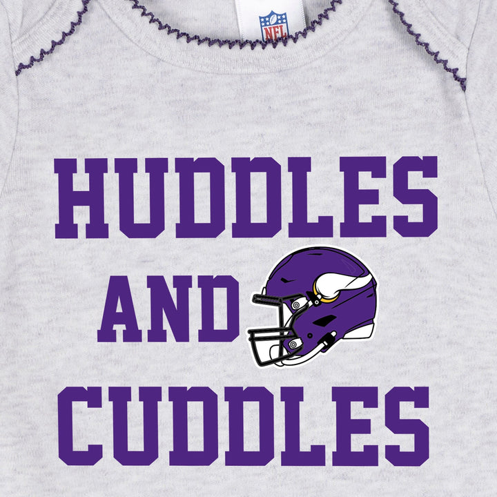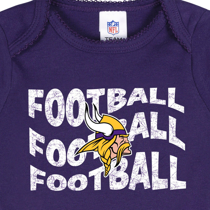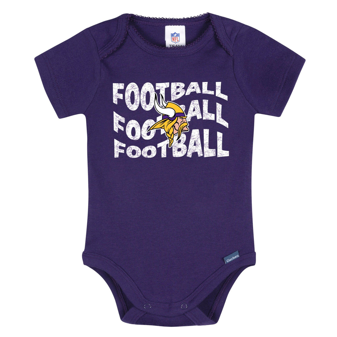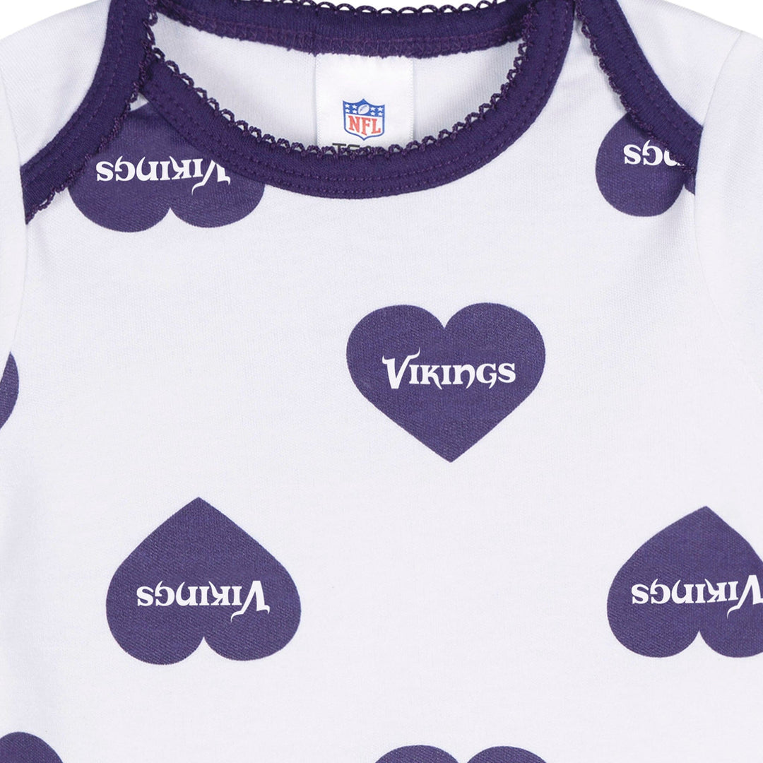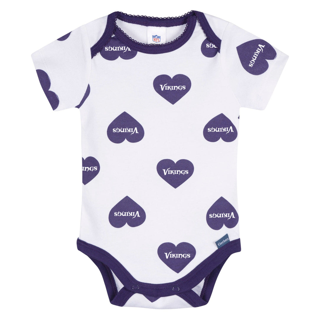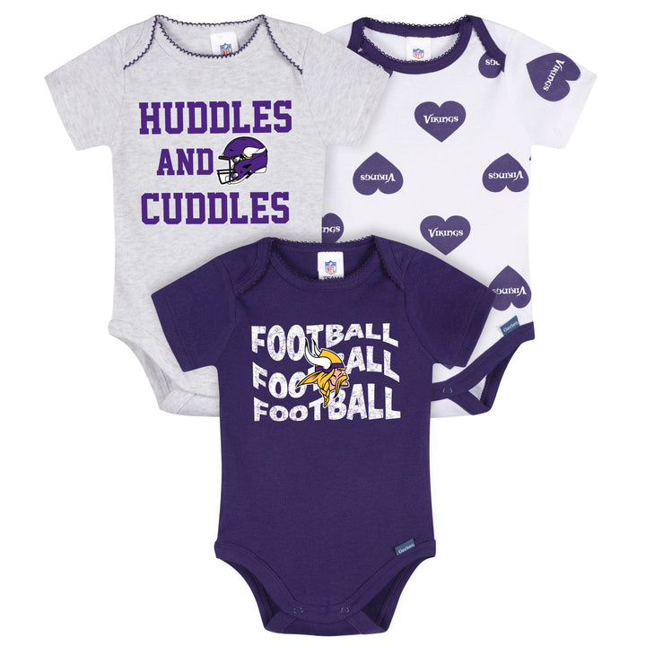 Get your little one ready to cheer "Skol!" in these adorable Vikings bodysuits! Made with soft, smooth fabric that has a thick, durable feel, they’re perfect for keeping baby comfy all day long. The lap shoulder neckline makes dressing a breeze, while leg snaps allow for easy diaper changes. Stretchy ribbing at the neckline and leg openings provides a flexible, comfy fit. With heart-accented Vikings graphics, this 3-pack is full of team spirit! Our essentials have been independently certified with STANDARD 100 by OEKO-TEX so that you don’t have to worry about harmful substances in your little one's wardrobe. Includes three baby girl bodysuits.