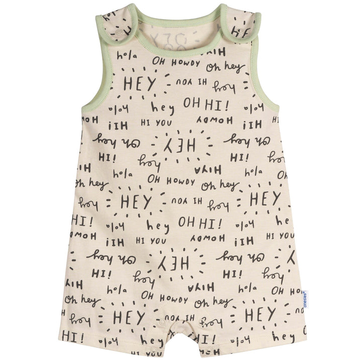 Get ready for playtime with this pack of three delightful gender-neutral baby rompers! Crafted from 100% cotton, they're soft and gentle on sensitive skin, ensuring all-day comfort for your active little one. With convenient leg snaps for easy dressing and diaper changes, plus stretchy leg holes for a flexible fit, these rompers are designed for carefree fun. Featuring a color scheme of blue, green and cream, this multi-pack features fun giraffes, dots and text greetings. The designs add an exciting touch, making these rompers a cute choice for any energetic little one who loves to play and explore! Our essentials have been independently certified with STANDARD 100 by OEKO-TEX® so that you don’t have to worry about harmful substances in your wardrobe. Pack includes three rompers.