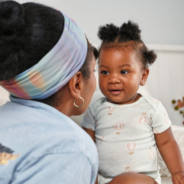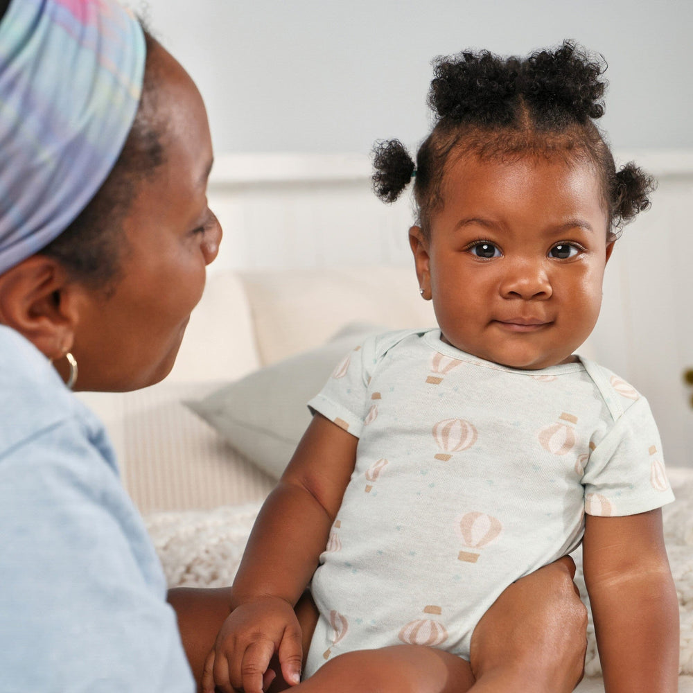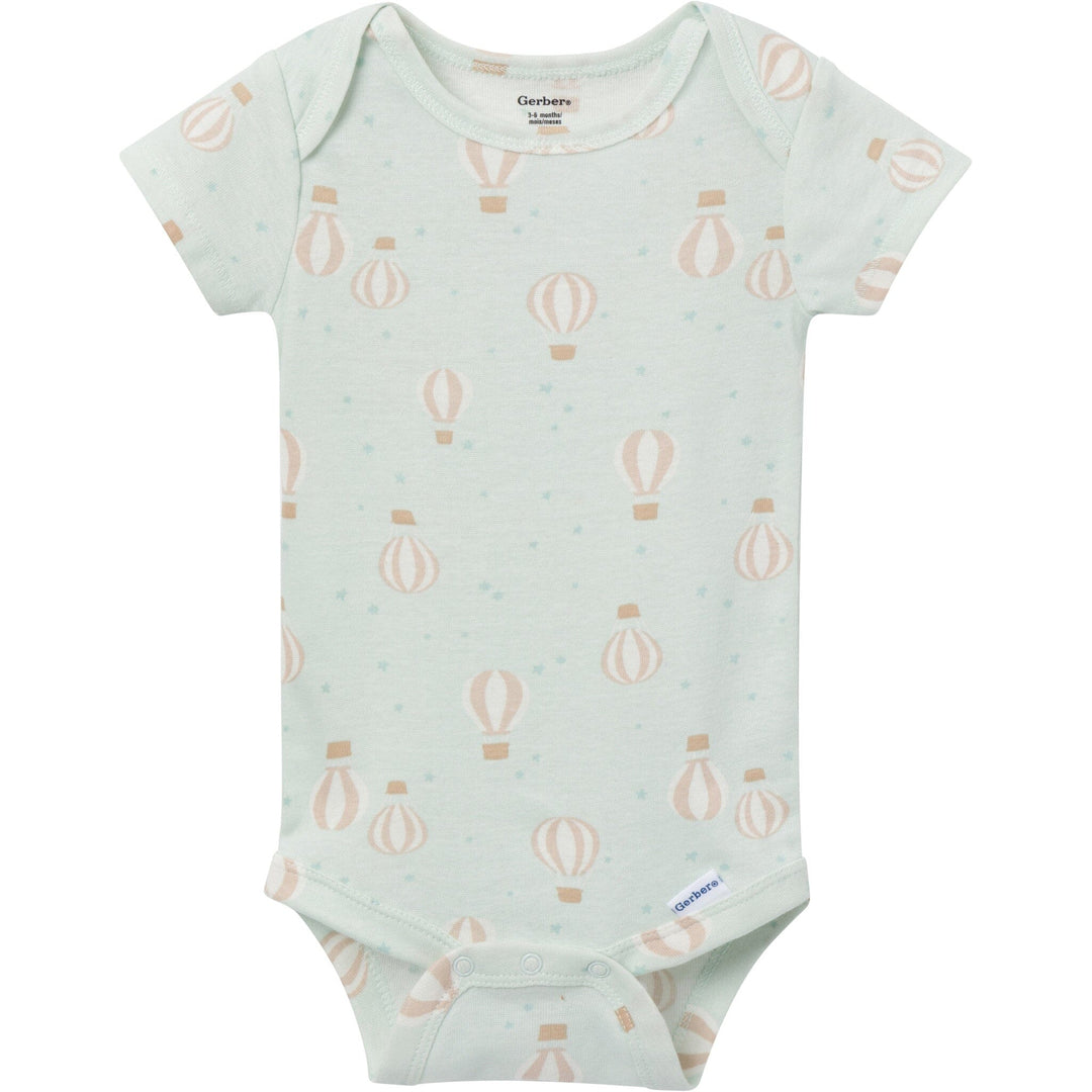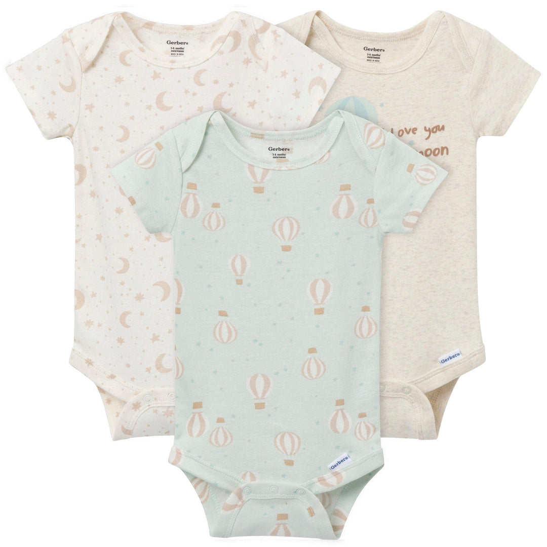 This 3-pack of Onesies® bodysuits is as dreamy as it gets! Featuring charming screen print moon and hot air balloon designs, these bodysuits add a touch of whimsy to everyday wear. Made from 100% soft cotton, they’re gentle on baby’s sensitive skin. The lap shoulder neckline makes removal easy, while the flexible ribbing at the neckline and leg holes ensures a comfy, snug fit. With easy snaps for quick changes, these bodysuits are perfect for busy parents and adorable little ones. Our essentials have been independently certified with STANDARD 100 by OEKO-TEX® so that you don’t have to worry about harmful substances in your little one's wardrobe. Pack includes three short sleeve Onesies® bodysuits.