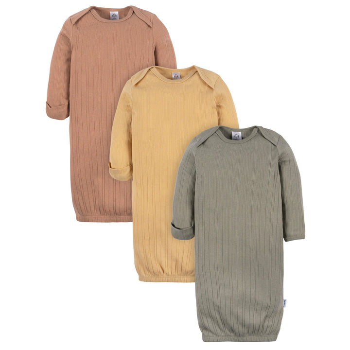 Earthy hues and warm, rustic vibes define this 3-pack of baby gowns. Made from soft, 100% cotton, these newborn and baby gowns provide a breathable, yet cozy, feel. The lap shoulder neckline and elastic bottom opening make changes quick and simple, minimizing nighttime sleep disruptions. The gowns provide optimal air flow for newborns but can be layered over a Onesies® bodysuit for extra warmth if needed. Our essentials have been independently certified with STANDARD 100 by OEKO-TEX® so that you don’t have to worry about harmful substances in your little one's wardrobe. Includes three baby gowns.