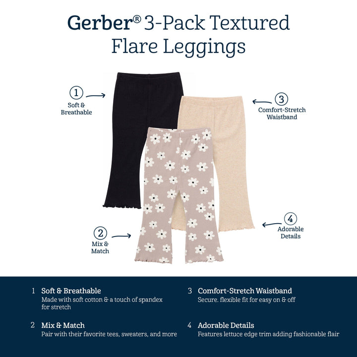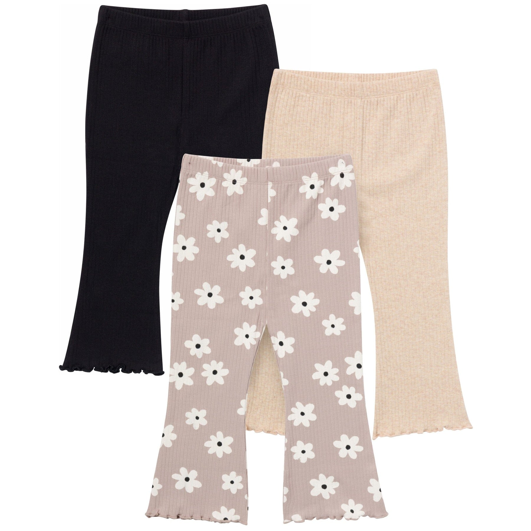 Sweet and stylish, this 3-pack of baby and toddler girl flare leggings brings a fun flair to everyday dressing. Featuring a bold daisy print on taupe, a soft ivory solid, and a classic black ribbed style, each pair is finished with a dainty lettuce edge hem that adds an extra-special touch. Perfect for twirling or lounging, these leggings are as comfy as they are cute. Our essentials have been independently certified with STANDARD 100 by OEKO-TEX® so that you don’t have to worry about harmful substances in your little one’s wardrobe. Includes three leggings.