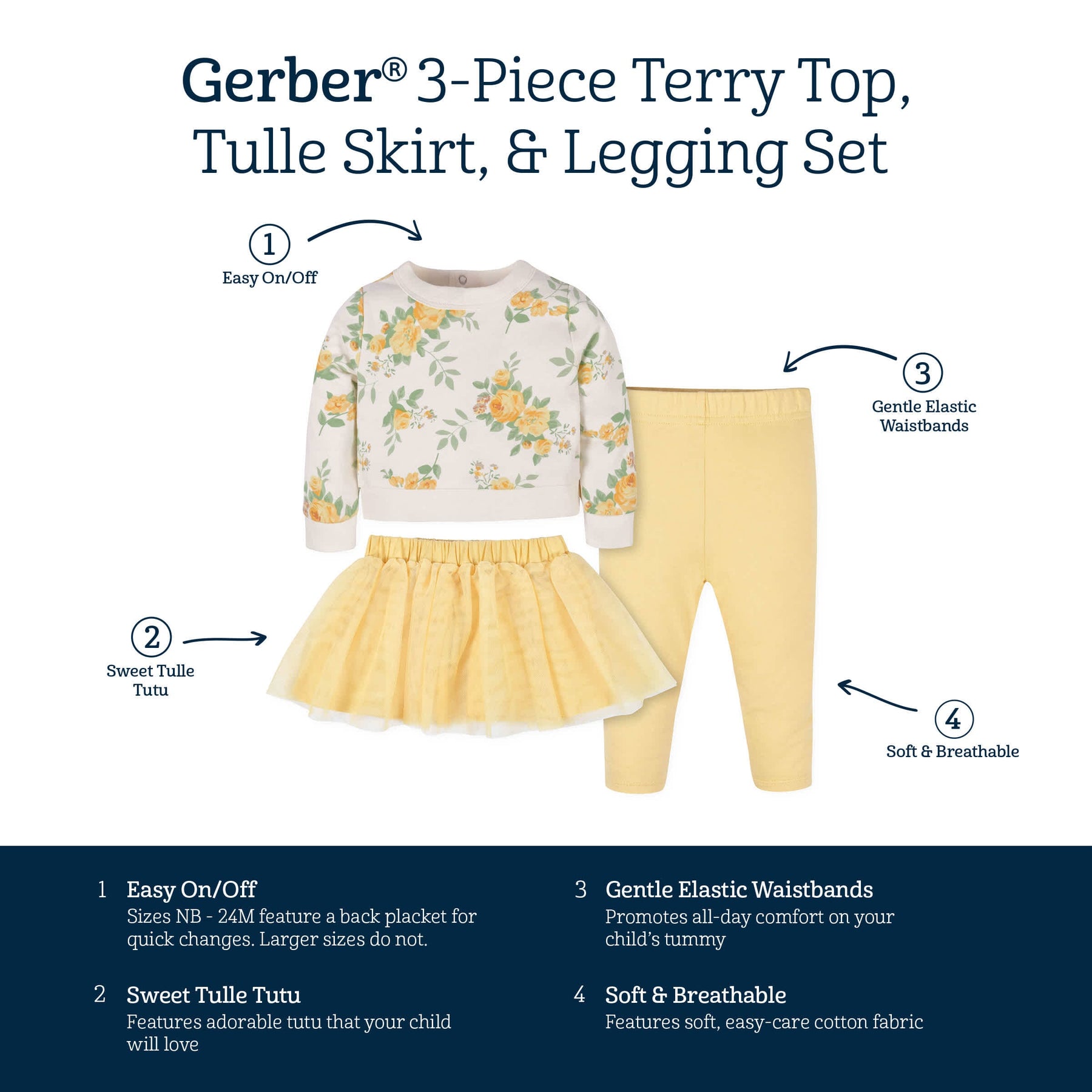 • Soft French terry top features long sleeves, crew neck & back placket for easier changes in infant sizes only (NB - 24M). Leggings feature easy, pull-on design with gentle elastic waistband for tummy comfort. Tutu designed with soft cotton jersey underskirt for all-day comfort. Perfect to add flair to any outfit!.