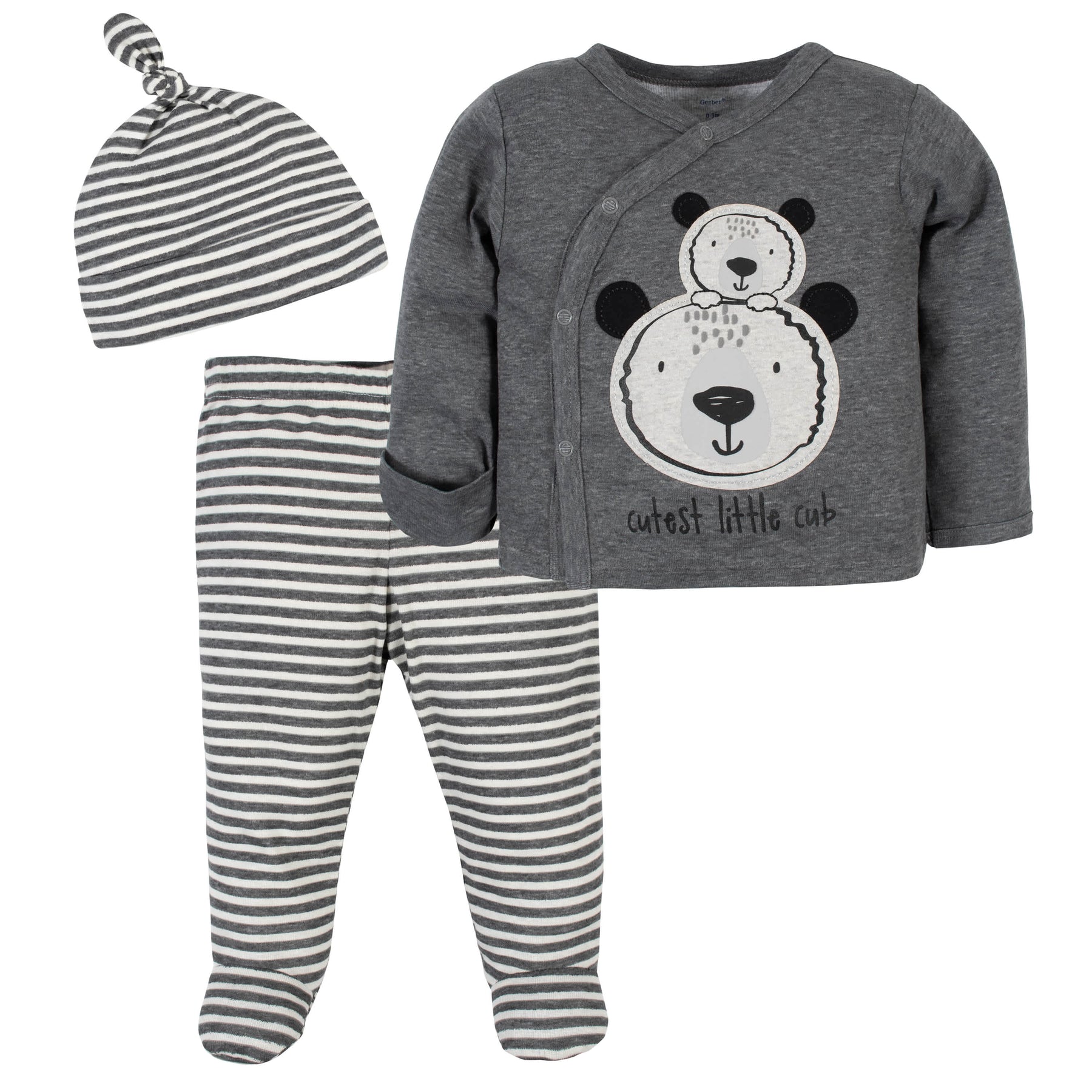 • Includes one side snap shirt, one pair of footed pants, and one cap