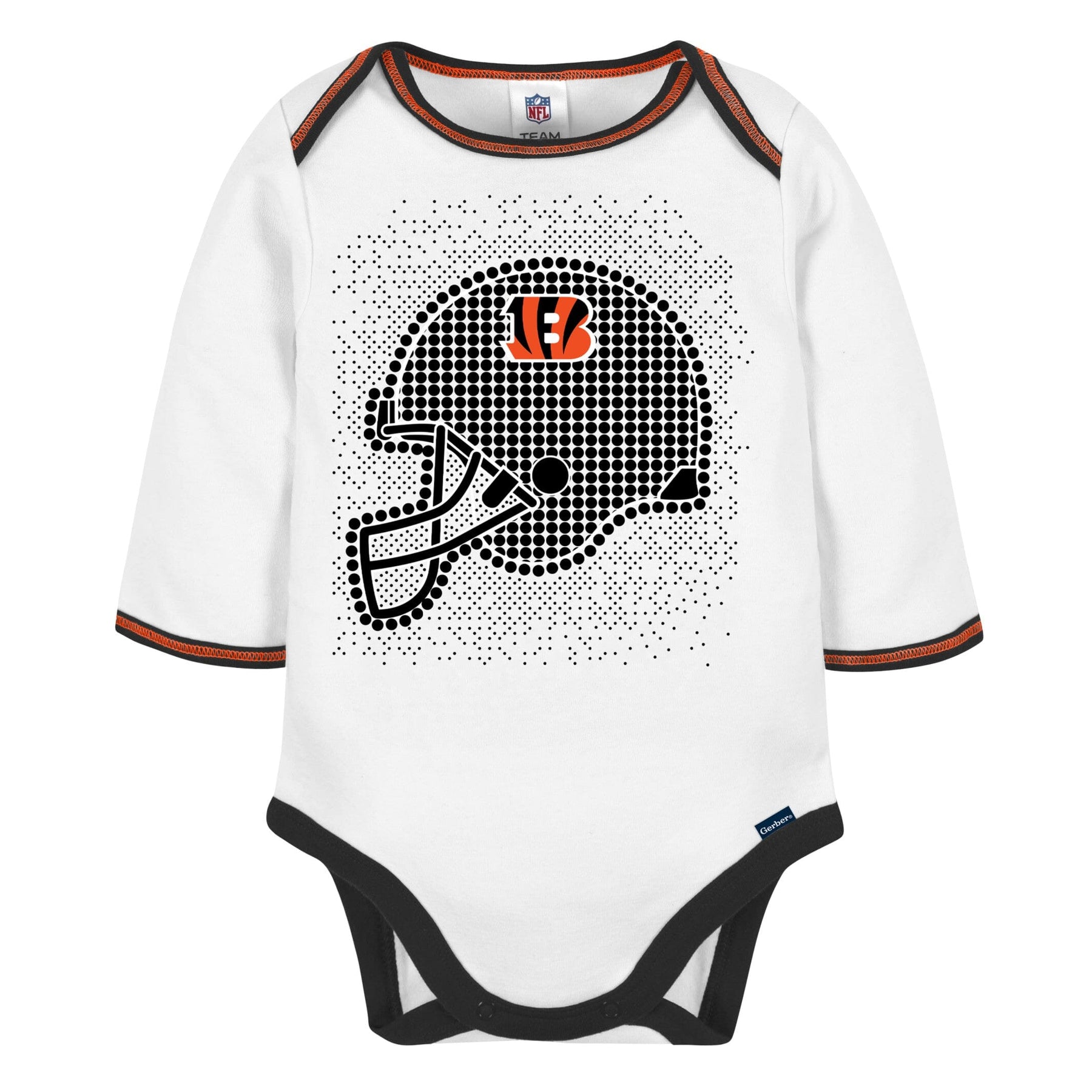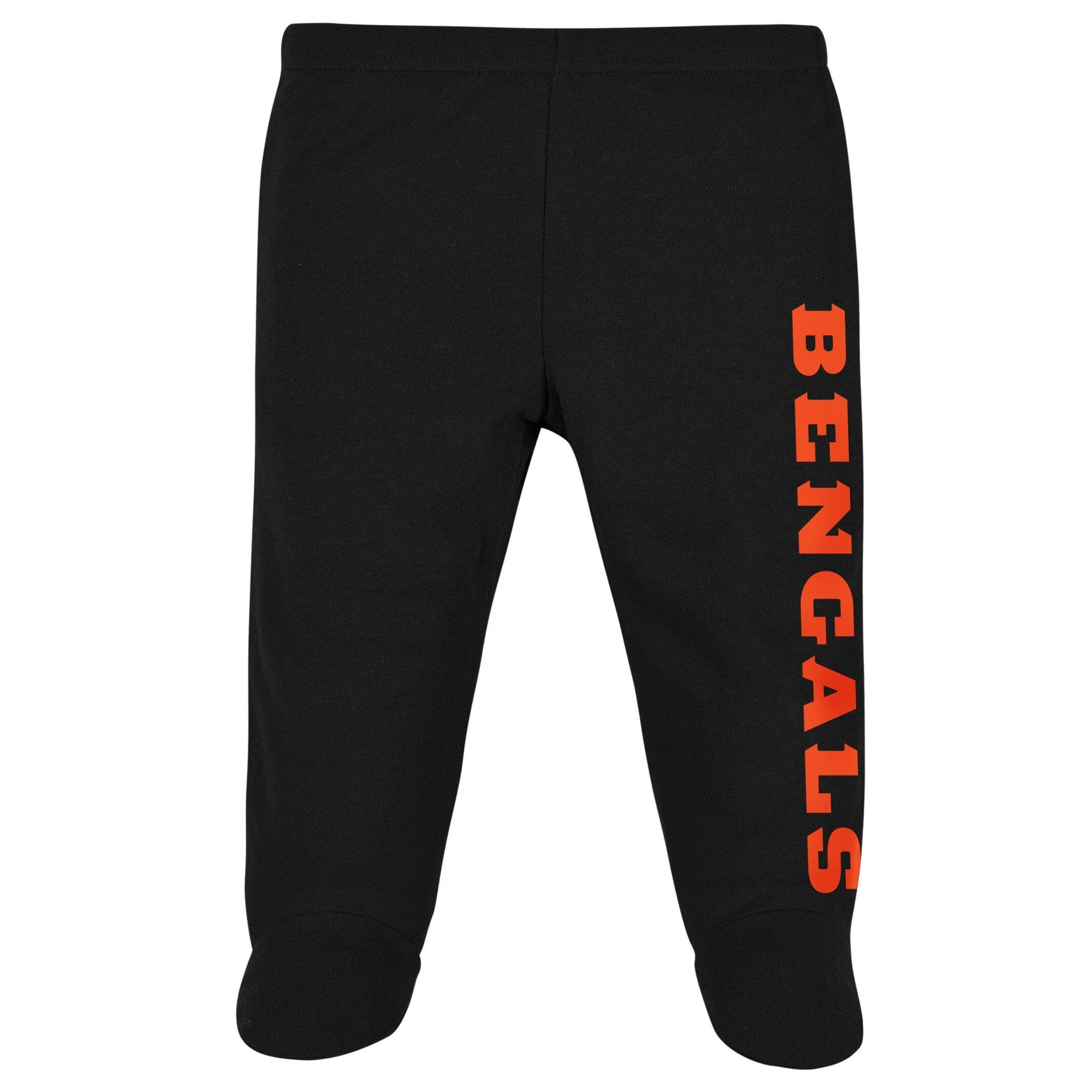 This officially licensed 3 piece set is the perfect first Bengals outfit for your little one! Your baby will stay comfy throughout the entire game (and day!). The cotton/poly interlock bodysuit features an expandable lap shoulder neckline to keep changes comfortable and quick. The bodysuit also features a screen print helmet with team logo front and center to show off your little fan's team pride. The baby pants feature a gentle elastic waistband, and the cap features a soft cuff. This baby boys’ set is a perfect choice for those cool game days. Available in Cincinnati Bengals infant sizes.