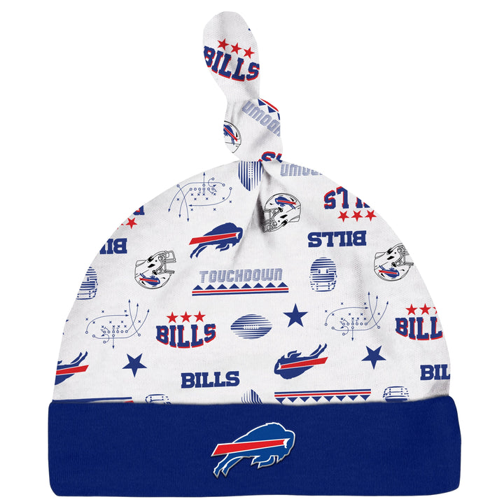 Boast your baby’s Bills pride with this 3-piece bodysuit, Sleep 'n Play, and cap set! This officially licensed NFL outfit is made with a soft cotton and polyester interlock to keep baby comfortable and content all game long. The bodysuit features an expandable lap shoulder neckline with high-positioned bottom snaps to keep changes quick and simple. It also has a bright and bold, screenprint team logo front and center. The Sleep 'n Play boasts a colorful print of your team’s logos and helmets and features inner thigh snaps with a back placket for comfort and convenience. The knotted cap features a soft cuff for comfort and will keep your little one snuggly warm in cool weather This outfit is machine washable and dryable. It includes one bodysuit, one cap, and one Sleep 'n Play.