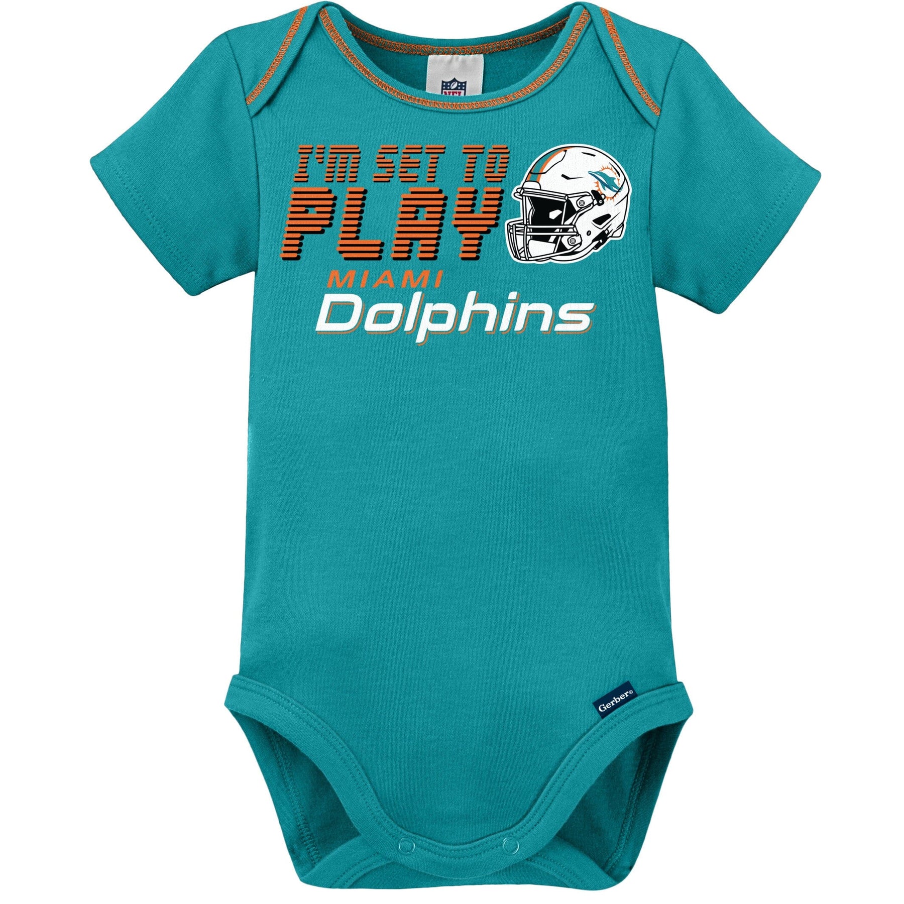 Boast your baby’s Dolphins pride with this 3-piece bodysuit, coverall, and cap set! This officially licensed NFL outfit is made with a soft cotton and polyester interlock to keep baby comfortable and content all game long. The bodysuit features an expandable lap shoulder neckline with high-positioned bottom snaps to keep changes quick and simple. It also has a bright and bold, screenprint team logo front and center. The coverall boasts a colorful print of the Miami Dolphins logos and helmets and features inner thigh snaps and a back placket for comfort and convenience. The knotted cap features a soft cuff for comfort and will keep your little one snuggly warm in cool weather.