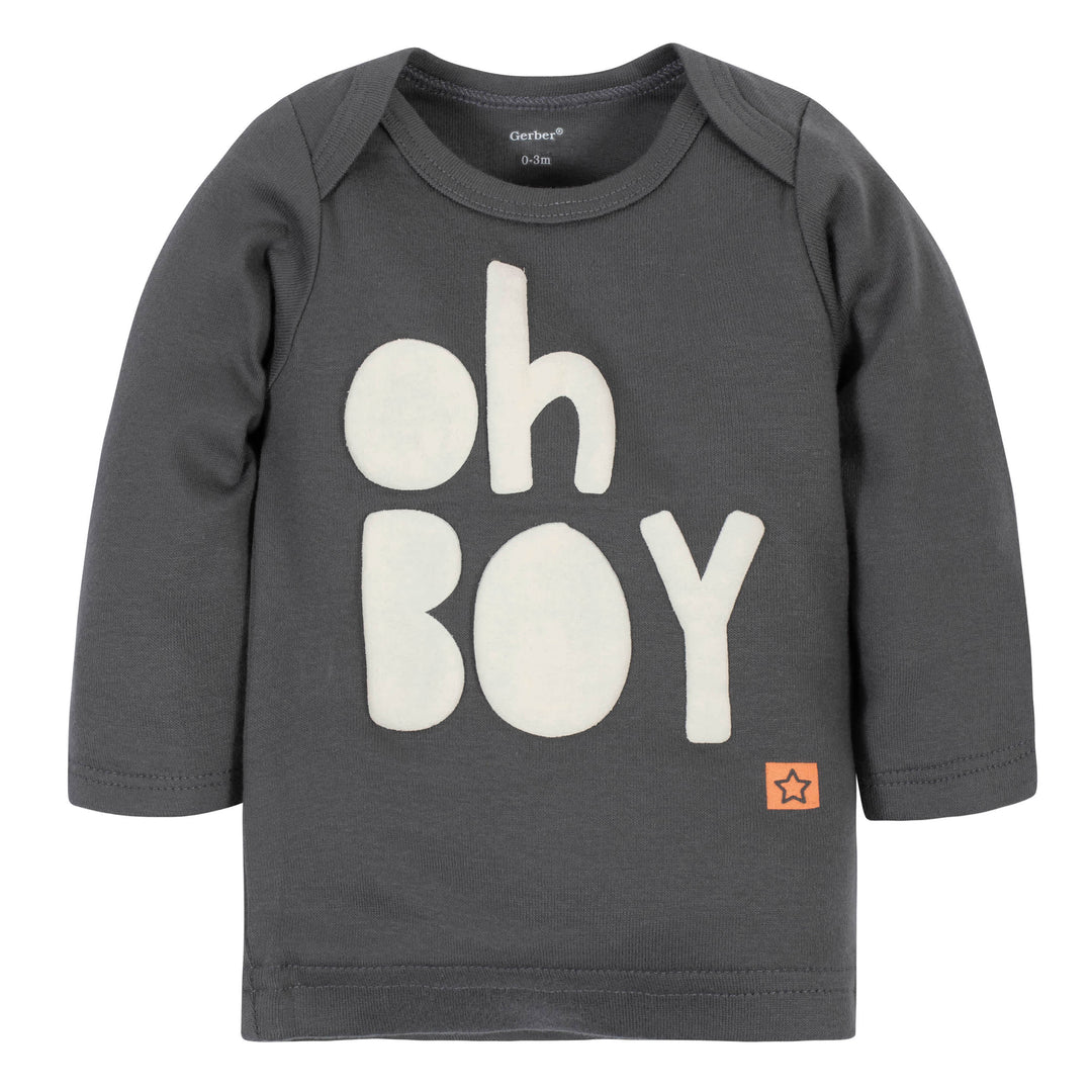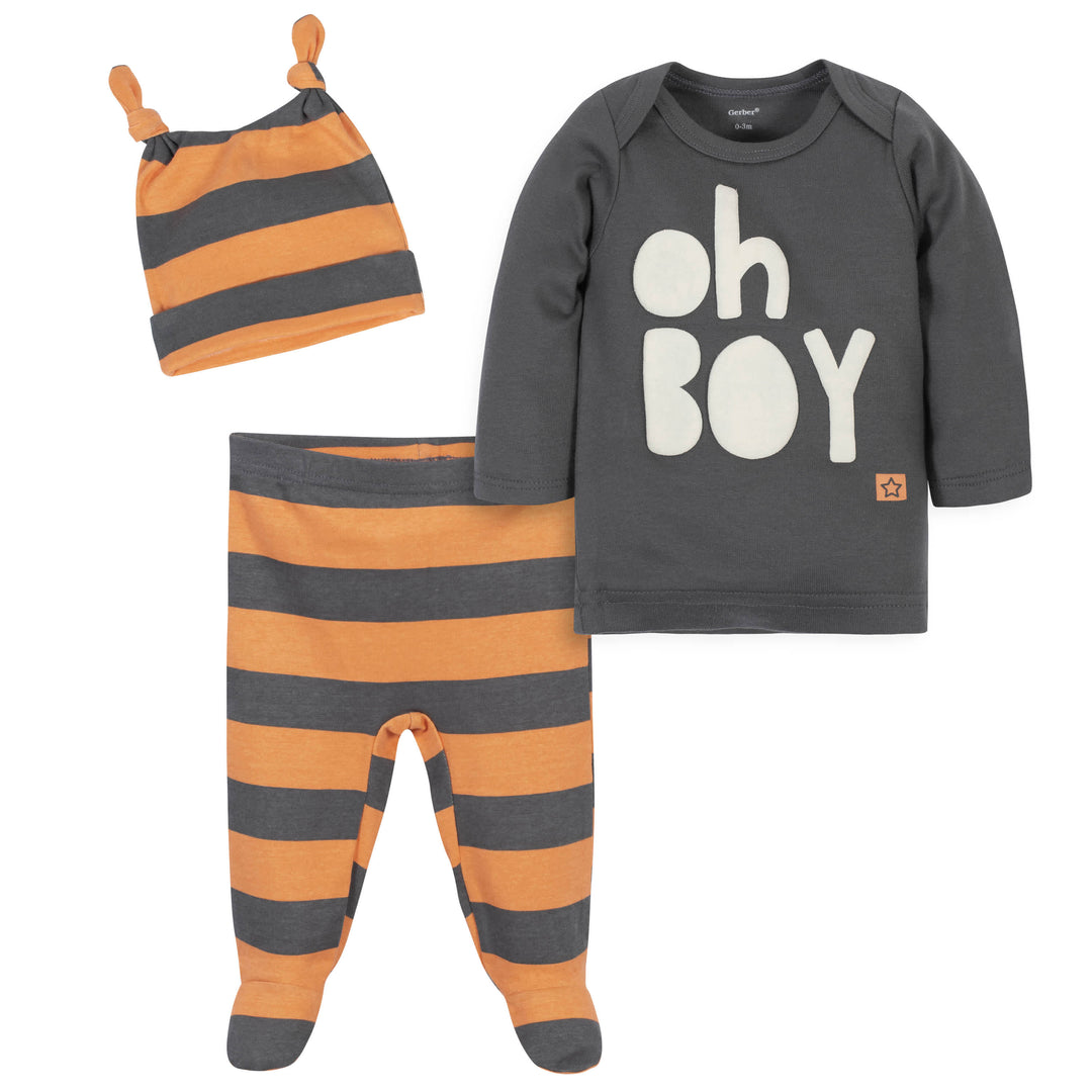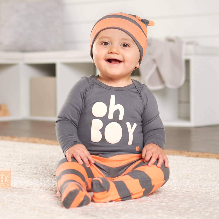 3-Piece Baby Boys Comfy Stretch "Oh Boy" Shirt, Footed Pant and Cap Set