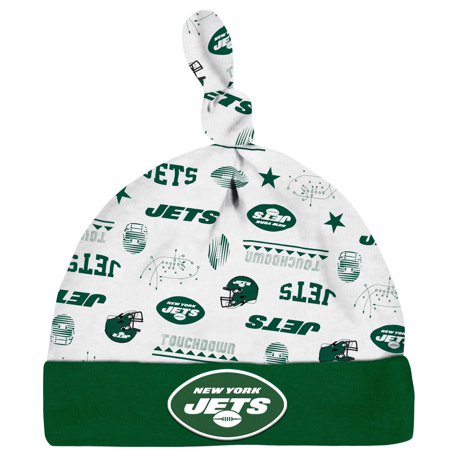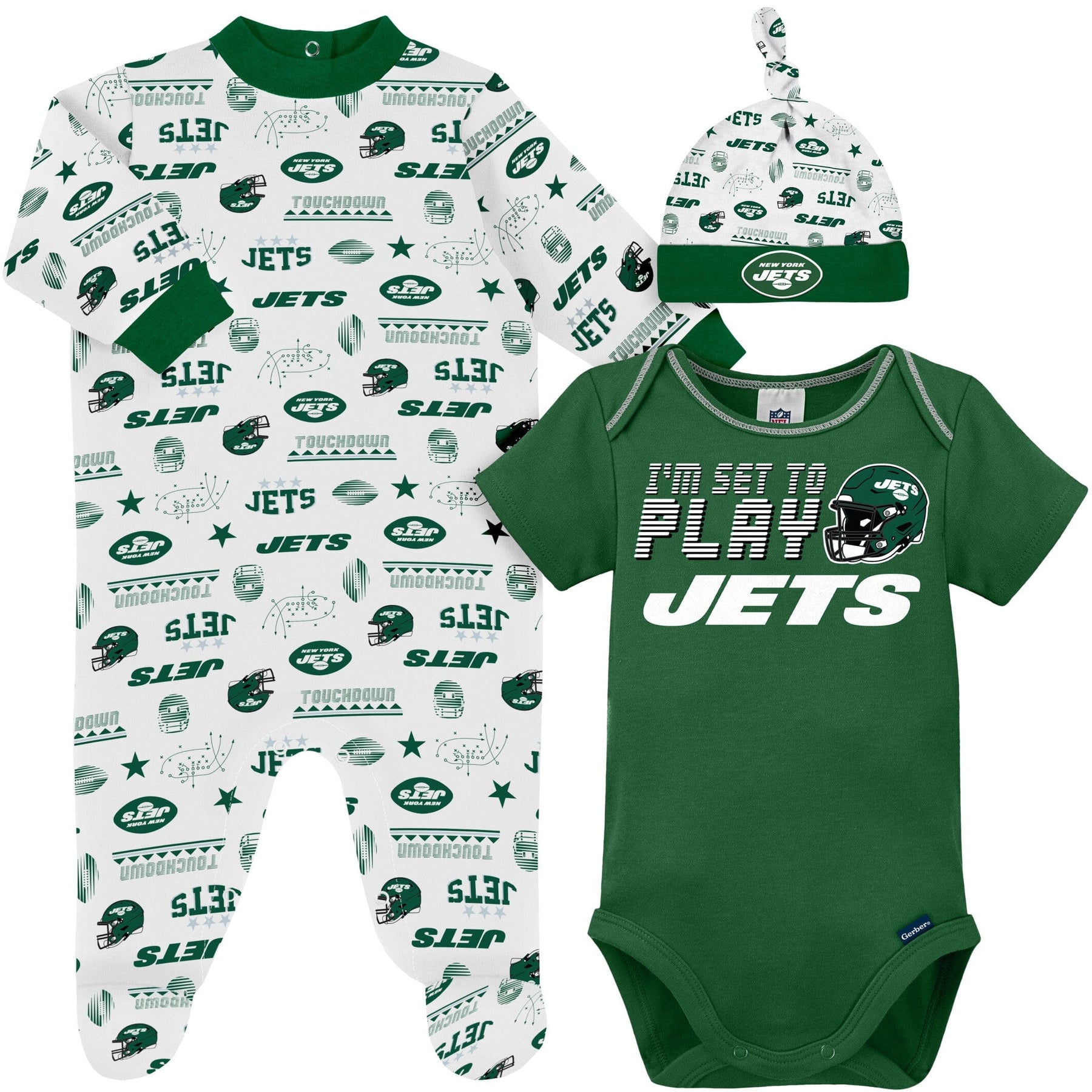 Boast your baby’s Jets pride with this 3-piece bodysuit, coverall, and cap set! This officially licensed NFL outfit is made with a soft cotton and polyester interlock to keep baby comfortable and content all game long. The bodysuit features an expandable lap shoulder neckline with high-positioned bottom snaps to keep changes quick and simple. It also has a bright and bold, screenprint team logo front and center. The coverall boasts a colorful print of the New York Jets logos and helmets and features inner thigh snaps and a back placket for comfort and convenience. The knotted cap features a soft cuff for comfort and will keep your little one snuggly warm in cool weather.