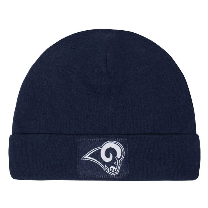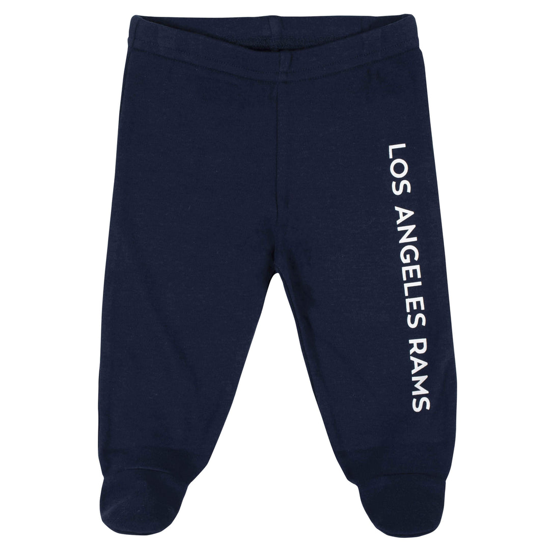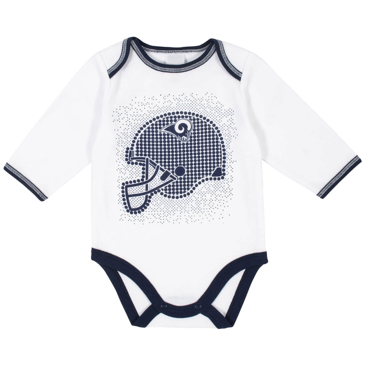 This officially licensed NFL 3-piece set is the perfect first Rams outfit for your little one! Your baby will stay comfy throughout the entire game (and day!) in the cotton/poly interlock fabric of this NFL baby bodysuit. The bodysuit features an expandable lap shoulder neckline to keep changes comfortable and quick. The bodysuit also features a screen print helmet with team logo front and center to show off baby’s team pride. The bottom snaps are positioned for convenient diaper changes, so taking breaks from the game won’t last long. The baby pants feature a gentle elastic waistband, and the cap features a soft cuff. This baby boys’ bodysuit is a perfect choice for those cool game days. This outfits includes one long sleeve bodysuit, one footed pant, and one cap. This outfit is machine washable for your convenience.